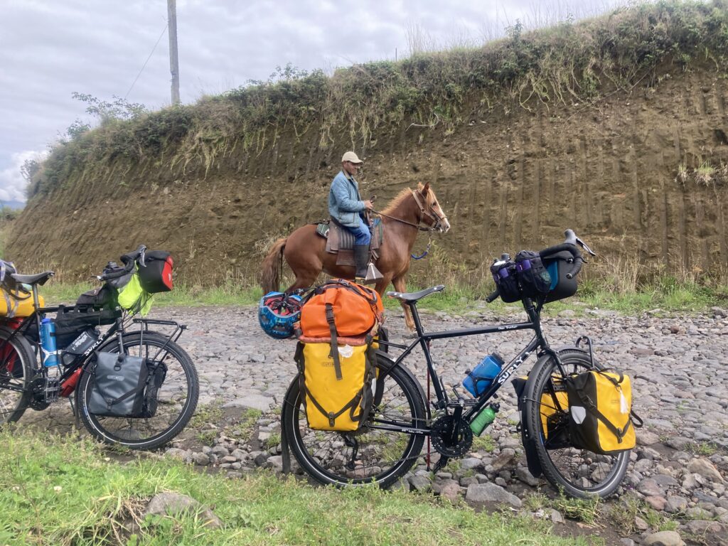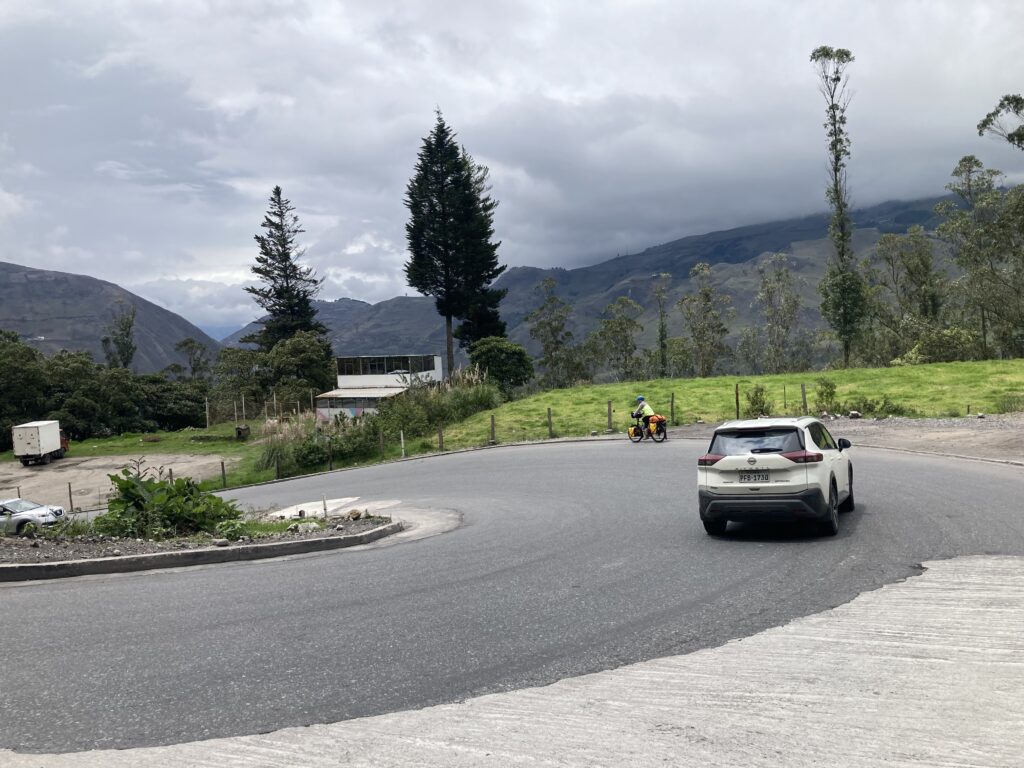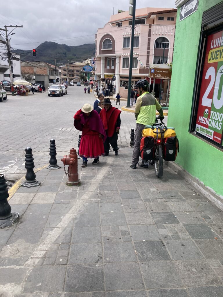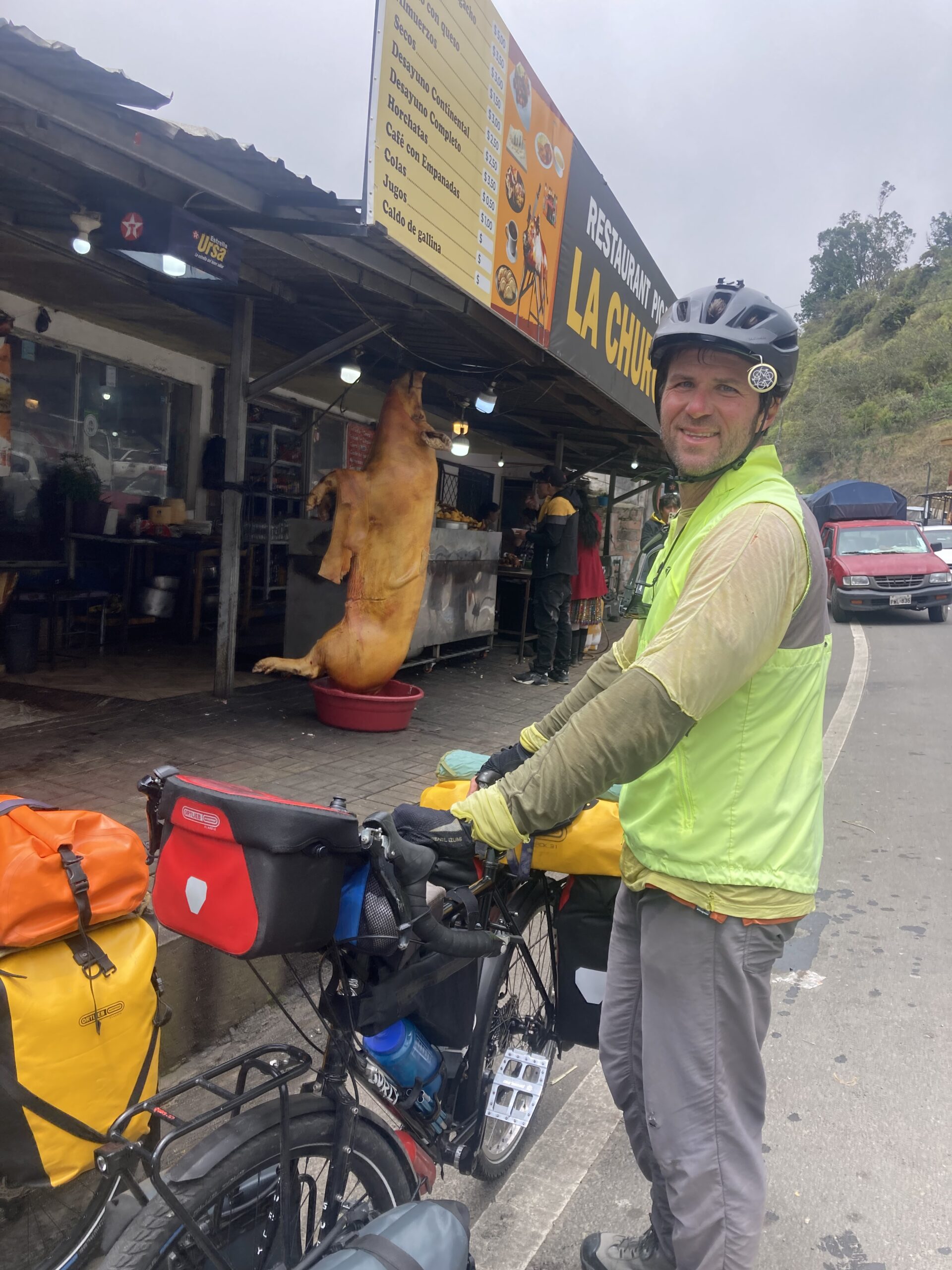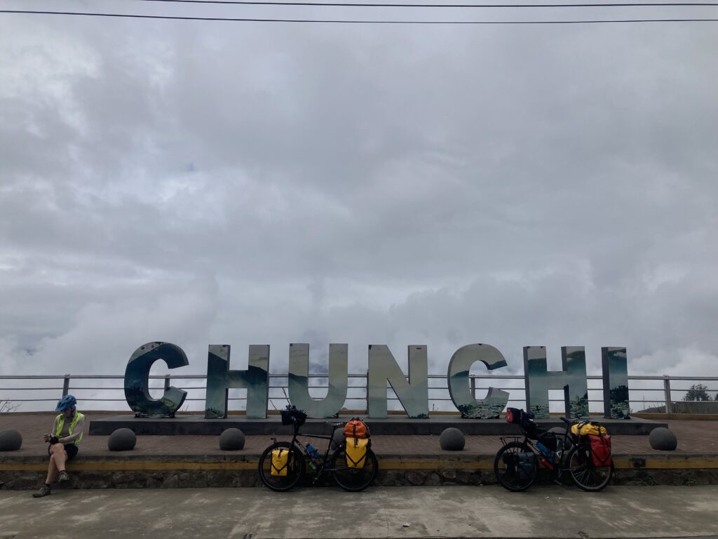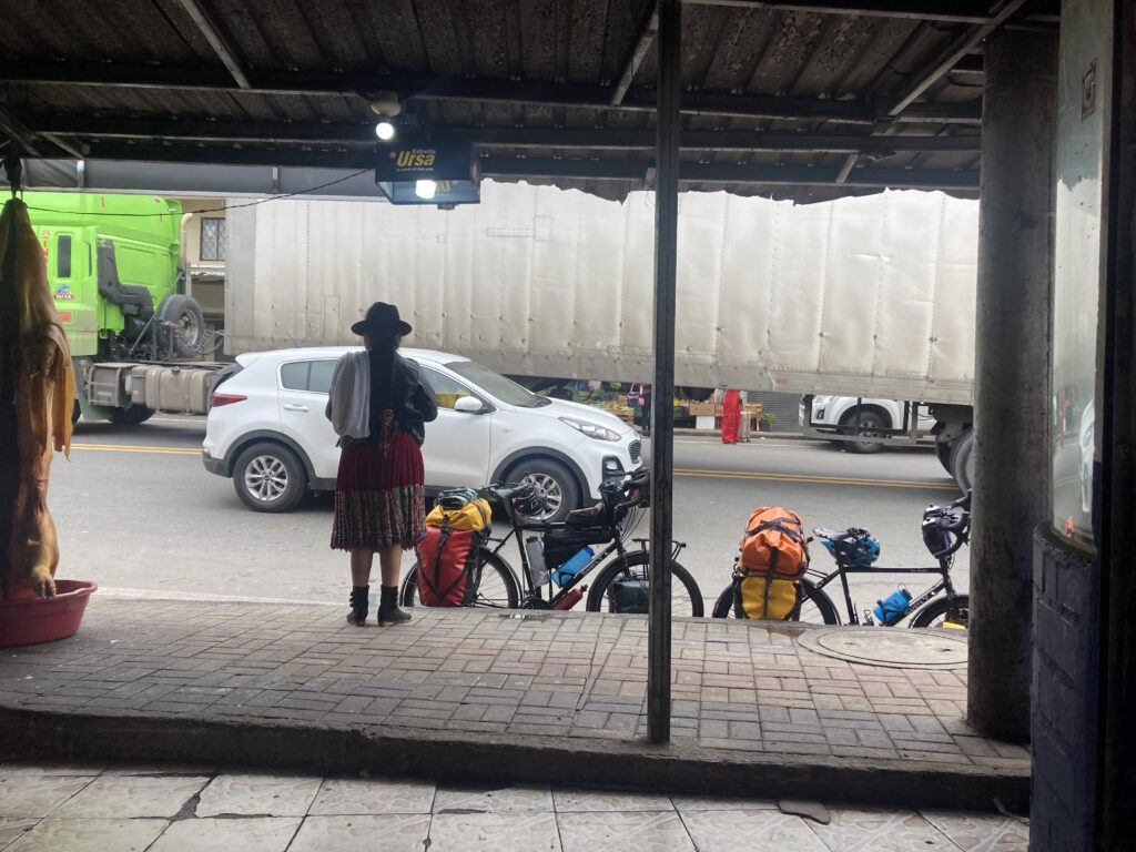 Climbing out of Chunchi was our only view of the day…all the rest was clouds. Its OK – we had a big climbing day so staying cooler was nice. Climbing into the cloudsMilk on the side of the road awaits pick-upClouded in but still nice views 🙂 More up…we climbed almost 5,500 feet between Chunchi & El TamboLunch stop in Zhud – all the local restaurants were hanging pigs. We picked the one that had seating with a view of the bicycles. While we ate lunch this local woman checked out our bikes We came across two other cyclists, Elisa & Cristian from Italy, who started in Ushuaia, Argentina in November 2024 and are headed north to Mexico.