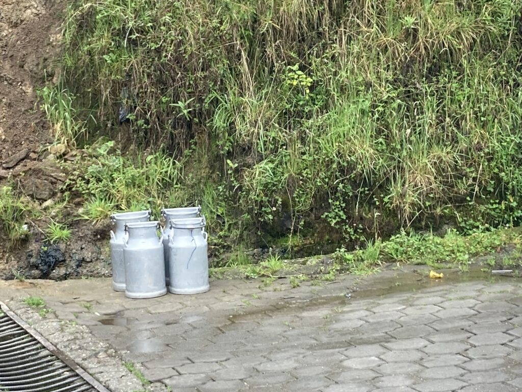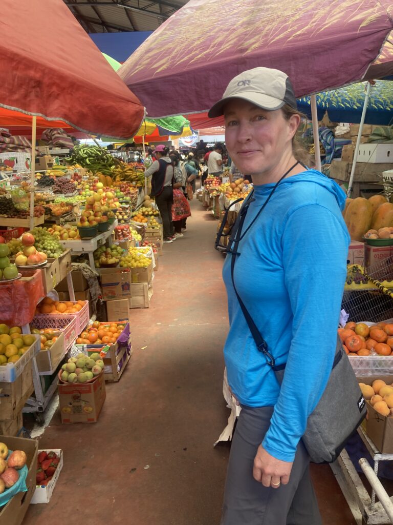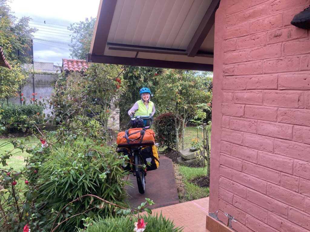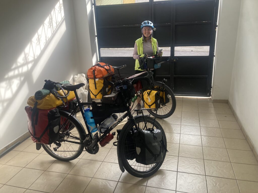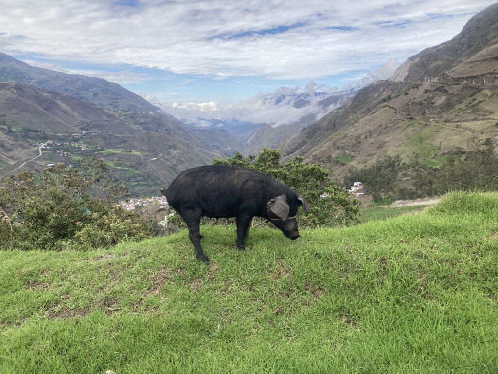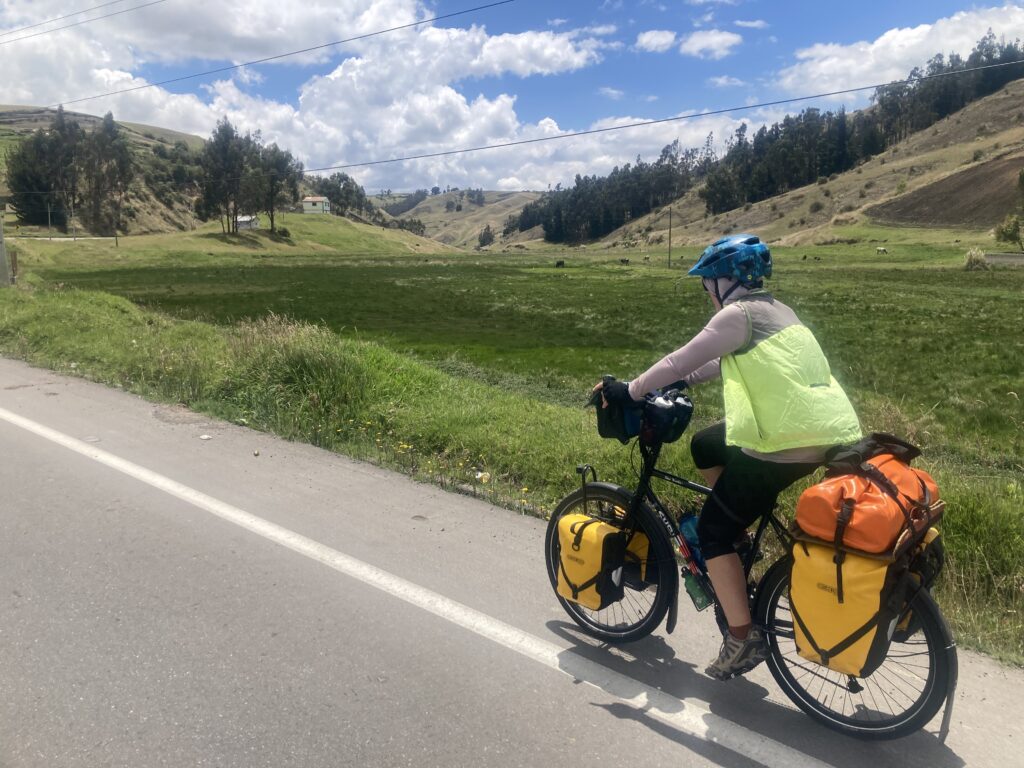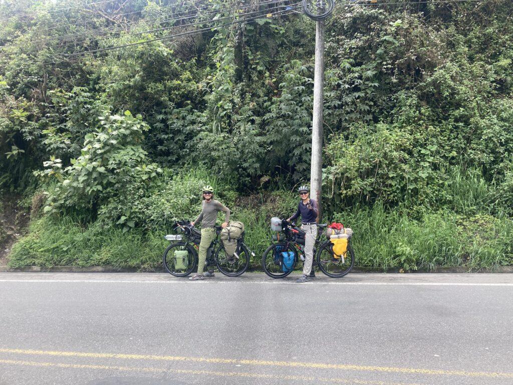 Climbing out of Chunchi was our only view of the day…all the rest was clouds. Its OK – we had a big climbing day so staying cooler was nice. Climbing into the cloudsMilk on the side of the road awaits pick-upClouded in but still nice views 🙂 More up…we climbed almost 5,500 feet between Chunchi & El TamboLunch stop in Zhud – all the local restaurants were hanging pigs. We picked the one that had seating with a view of the bicycles. While we ate lunch this local woman checked out our bikes We came across two other cyclists, Elisa & Cristian from Italy, who started in Ushuaia, Argentina in November 2024 and are headed north to Mexico.