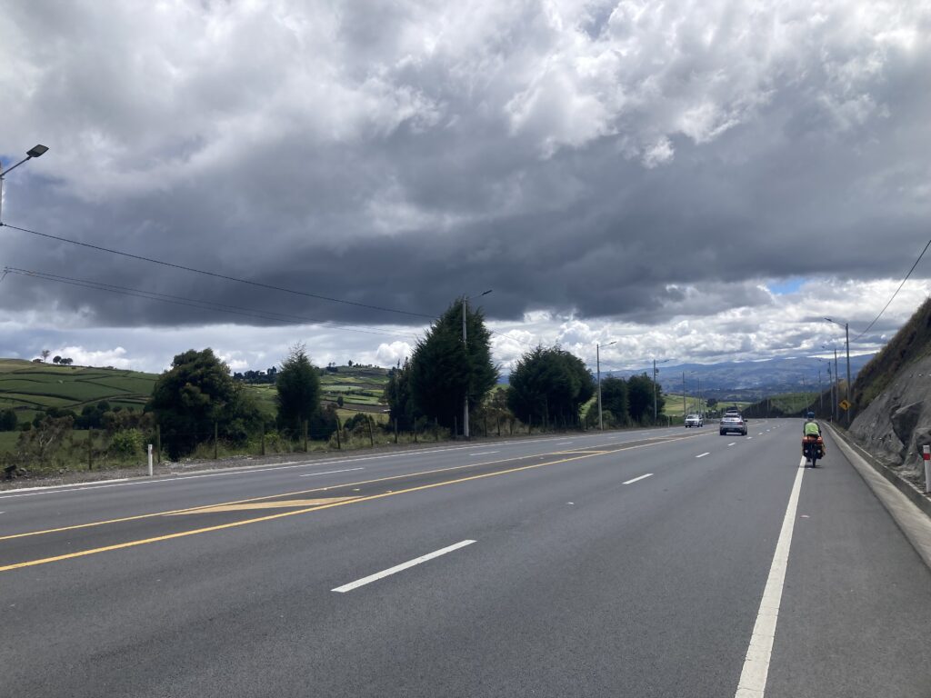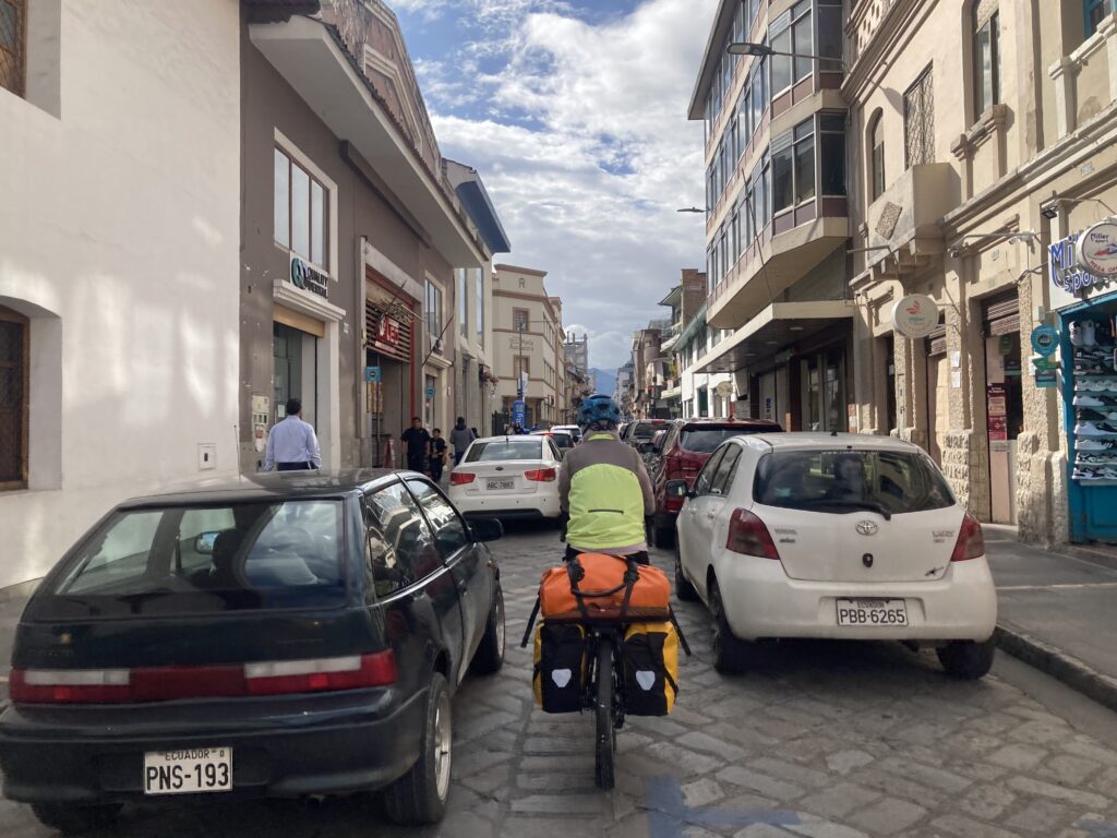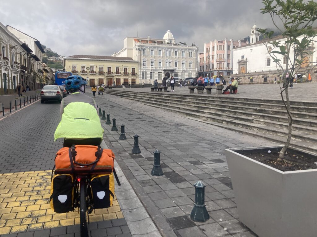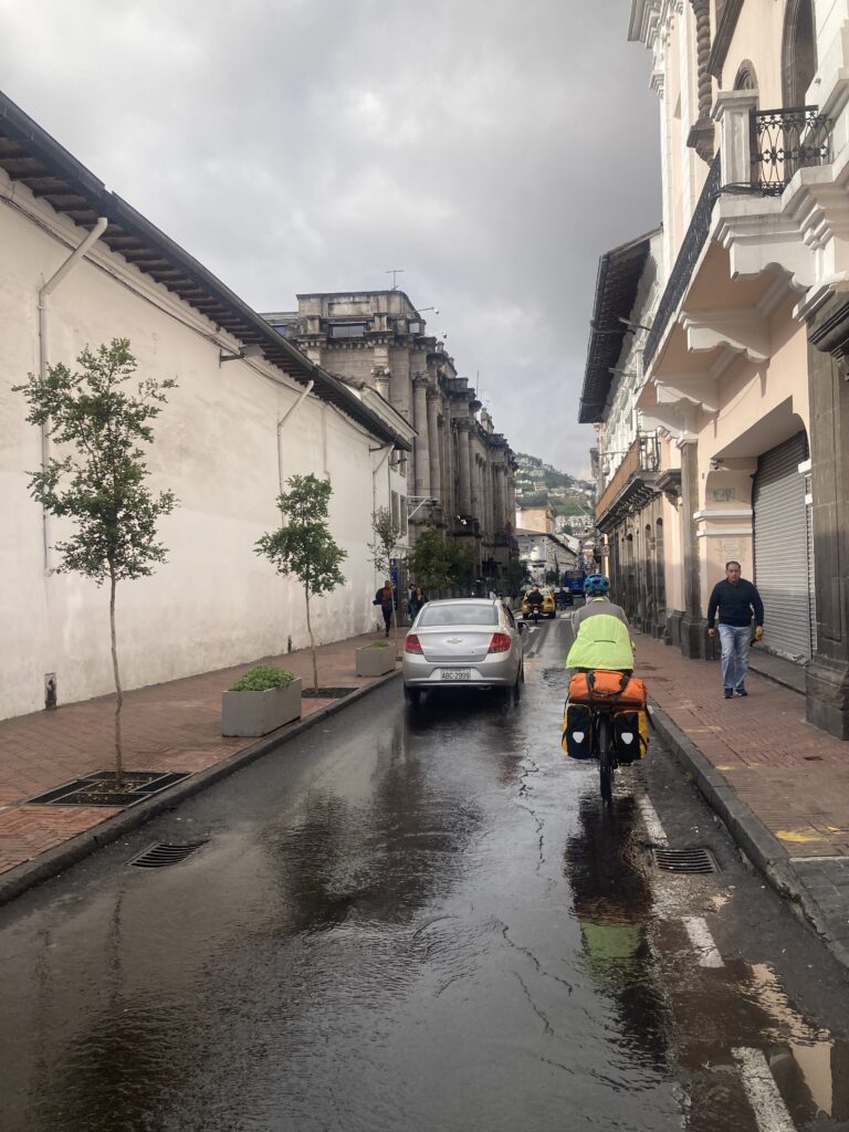 In the garage at our Quito AirBnB, packed and ready to head out.Riding through QuitoHow did we miss seeing this until our last morning in Quito?Old town of Quito before the chaos of the streets started…then we’re too focused to take any pictures. Finally out of Quito with a nice hard shoulder – we can enjoy the scenery