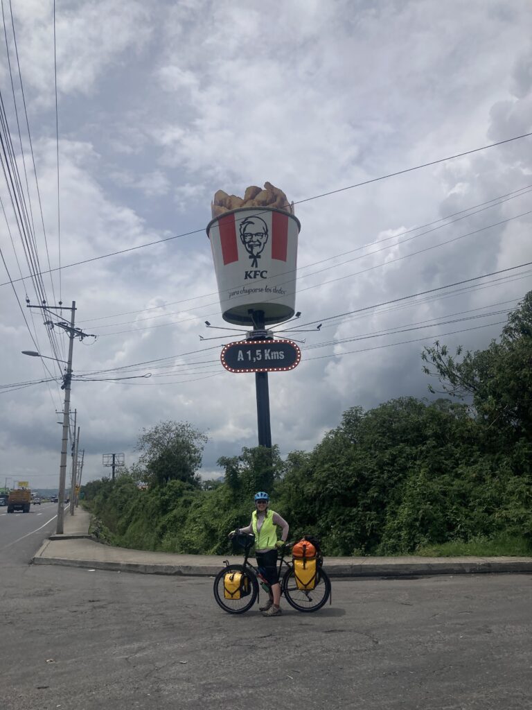 Just outside of Machachi there was a military base – we stopped for a much needed break from the PanAmerican Highway. Behind Dustin you can see a soldier statue.Advertising Machachi’s KFC – this must be a very popular fast food here because when we flew to the Galapagos people were bringing buckets of KFC to the islandsRiding into Machachi, in an area coined the Avenue of the Volcanoes, the low hanging clouds obstructed our views of the peaks Showered and cozy in Machachi with our cycling clothes hanging everywhere.