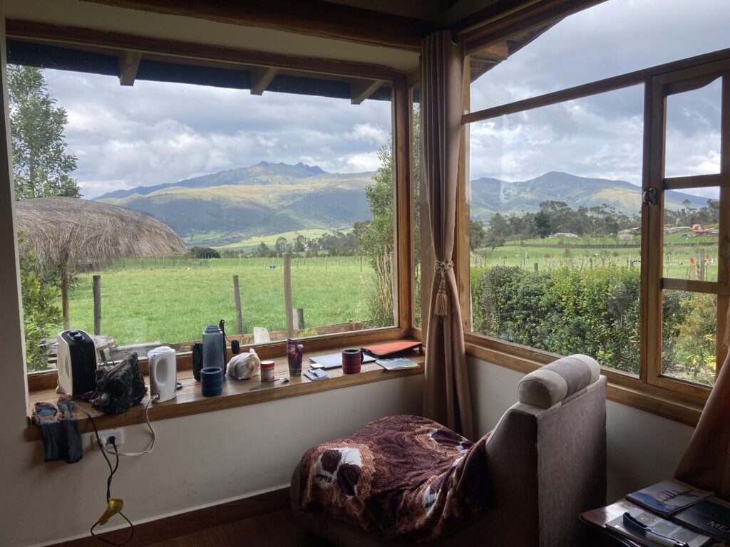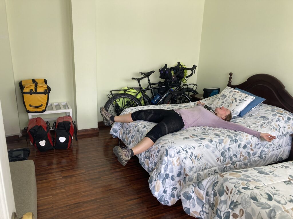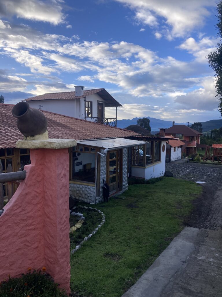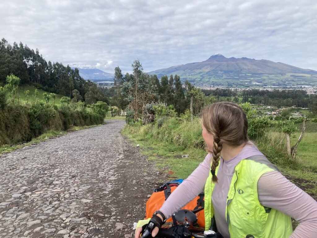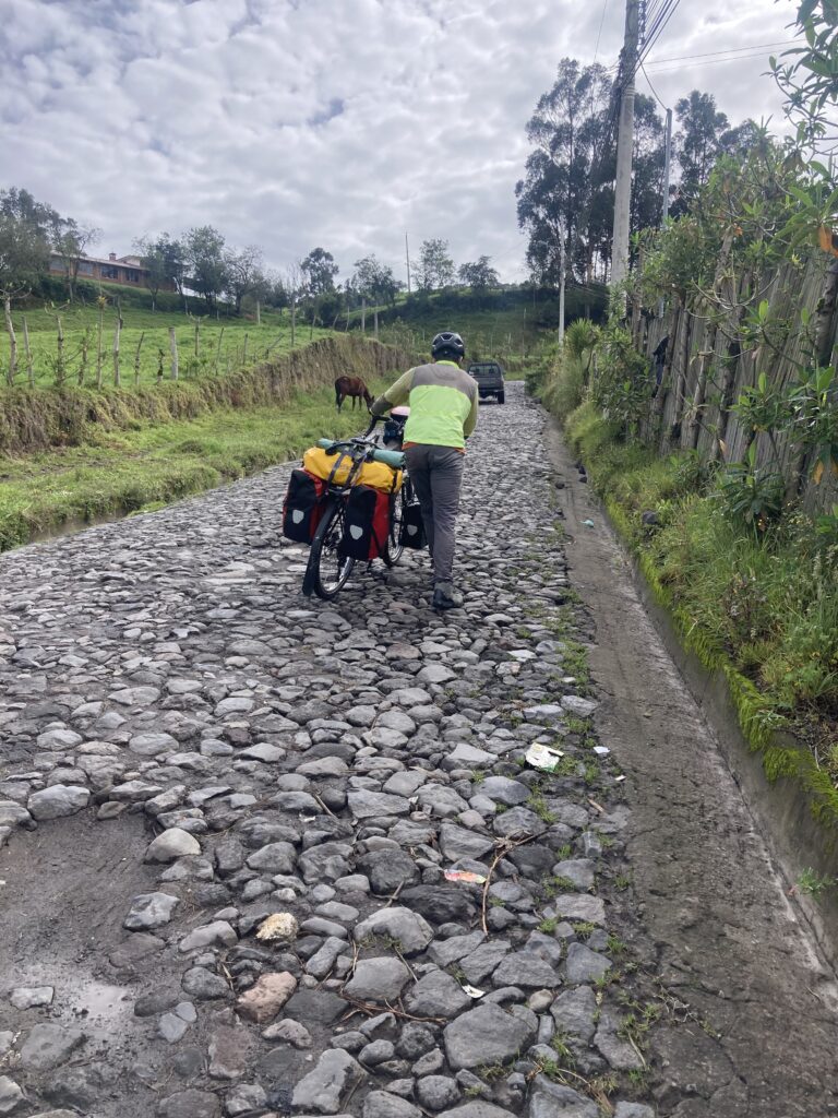 In attempting to make our way to Cotopaxi, the next day we cycled/pushed a meager 12km but gained 611m in elevation – it was a very hard fought 12km (7 miles) up large cobblestones and steep grades. For the cherry on top, we got to do the last hour in the rain (with a little hail). It is no understatement to say we were THRILLED to have reached our accommodation looking like a couple drowned rats on bicycles.