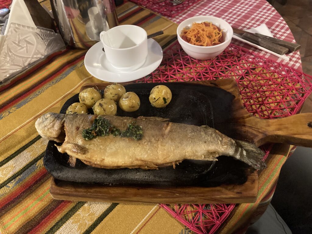 Dinner made by the manager’s mom while he was incapacitated – fish served on a sizzling hot lava rock that kept the food piping hot during the entire meal.