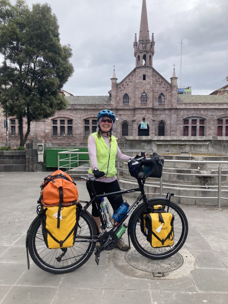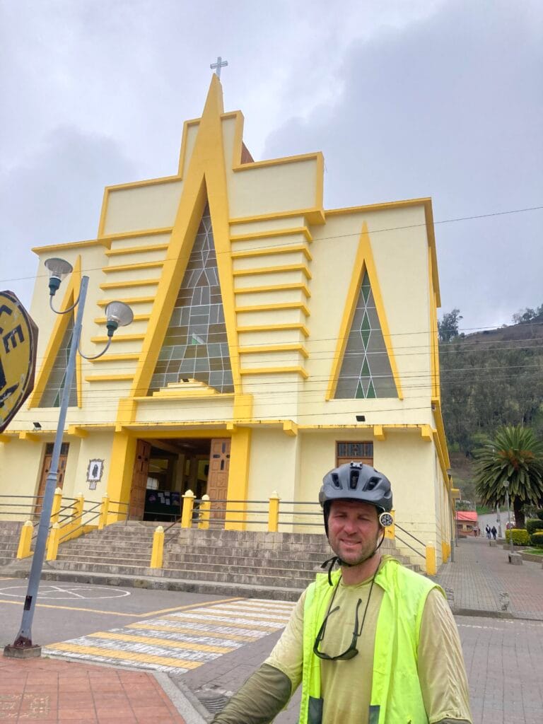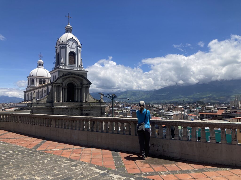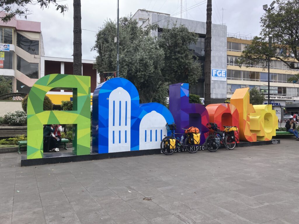 As we rolled into town we found las letras for Ambato in the Parque CevallosA unique church in Ambato. Similar to several Andean towns we’ve visited, Ambato was quite hilly making pedaling a loaded touring bicycle extra challenging – there were a few sections of hike-a-bike. In this photo, the white building near the center, is the Basilica Cathedral of Our Lady of the Elevation – the town’s main cathedral which was completed in 1954 after an earthquake destroyed the previous church from the 1600s.