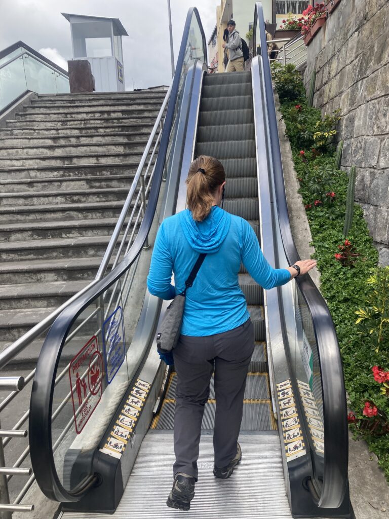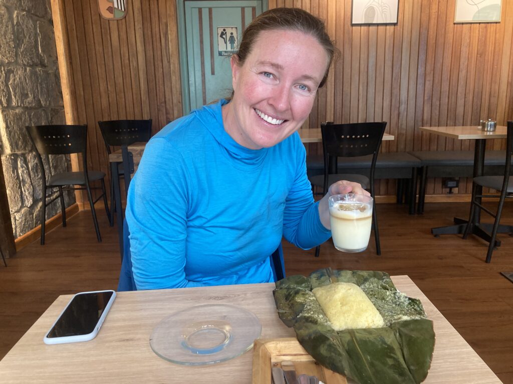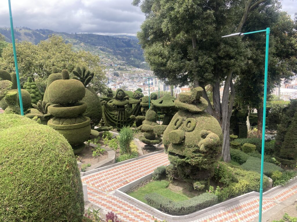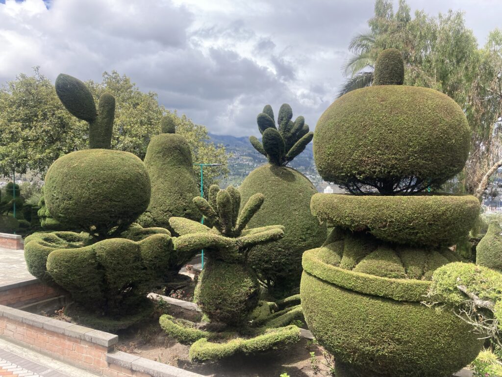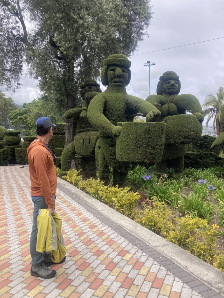 Ambato’s cathedral, Basilica Cathedral of Our Lady of the Elevation, is quite different than most we have seen in Latin America with its modernist flare. It was completed in 1954 after an earthquake destroyed the previous building. Inside Basilica Cathedral of Our Lady of the Elevation – this simplistic modernist building is quite the contrast to many of the gilded cathedrals we’ve seen.We enjoyed a Topiary Garden during our walk in AmbatoTo get up one of the busy hills in Ambato there was a series of 7 escalators – we were thankful! Taking a break at a cafe in Ambato we tried “Quimbalito” a steamed sweet dough served in a banana leaf. Did we mention our accommodation in Ambato was a 5th floor walk-up? Who booked this place?! Good thing we had a day off in Ambato to recover from the stairs 🙂