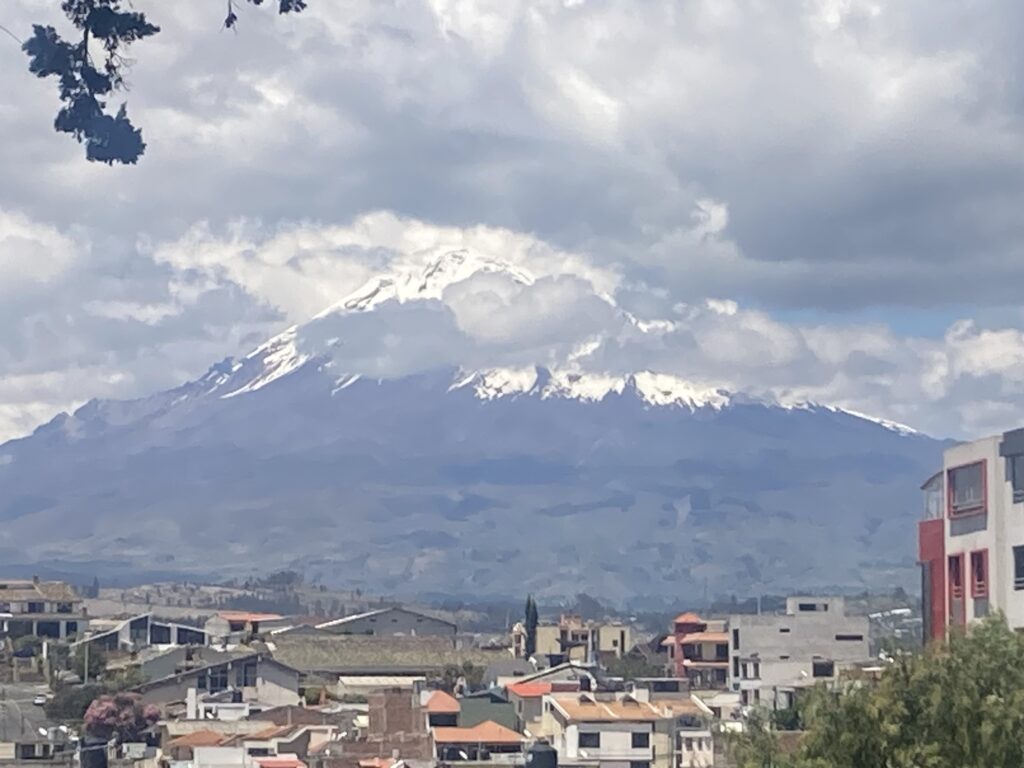 We are riding through an area that has been coined the “Avenue of Volcanoes” and we stayed the night in Machachi (pop. 24,000 el. 9,466 feet) which is a base camp for climbers hoping to summit Cotopaxi (5897m / 19,342 ft) – Ecuador’s second highest peak. Actually, there was a mix-up with a lost key at our hostel and we ended up in a room with an occasional view of Volcan Corazon (4790 m / 15,711 ft) when the clouds cleared.