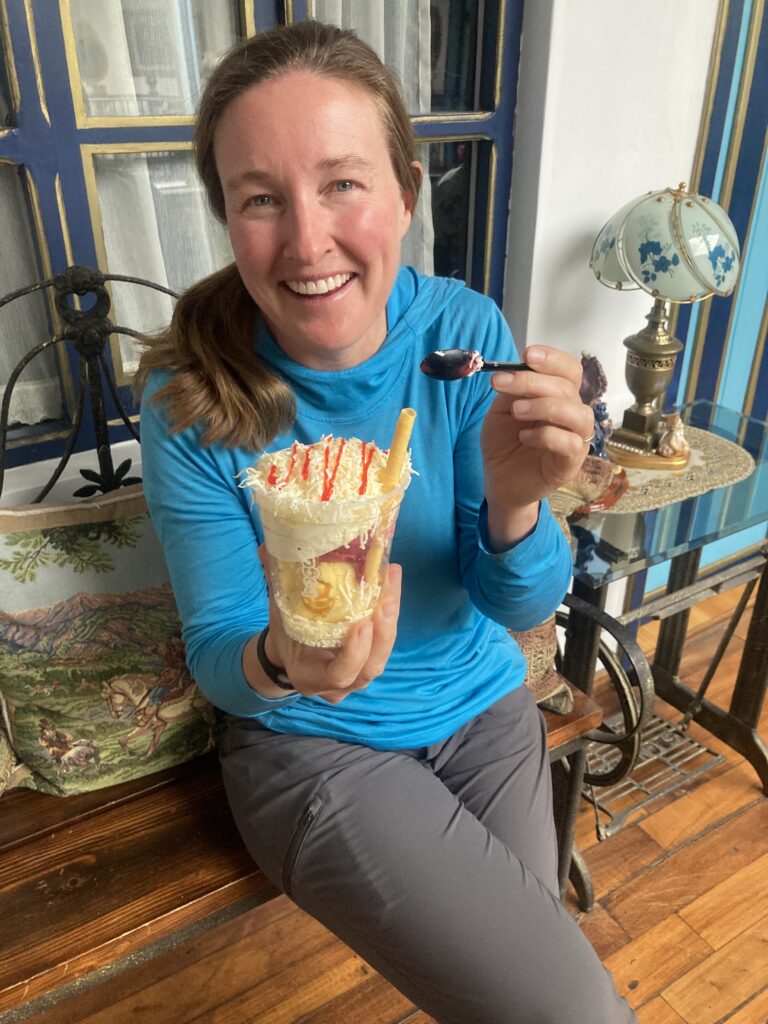 Dustin and Guido next to a mural of Riobamba in their restaurant – its the same mural shows the same church we took a picture of (above) – what a great guy! Helado con queso (ice cream with cheese) – we’d seen it a few times and just had to try it…quite good blend of the sweet & savory 🙂
