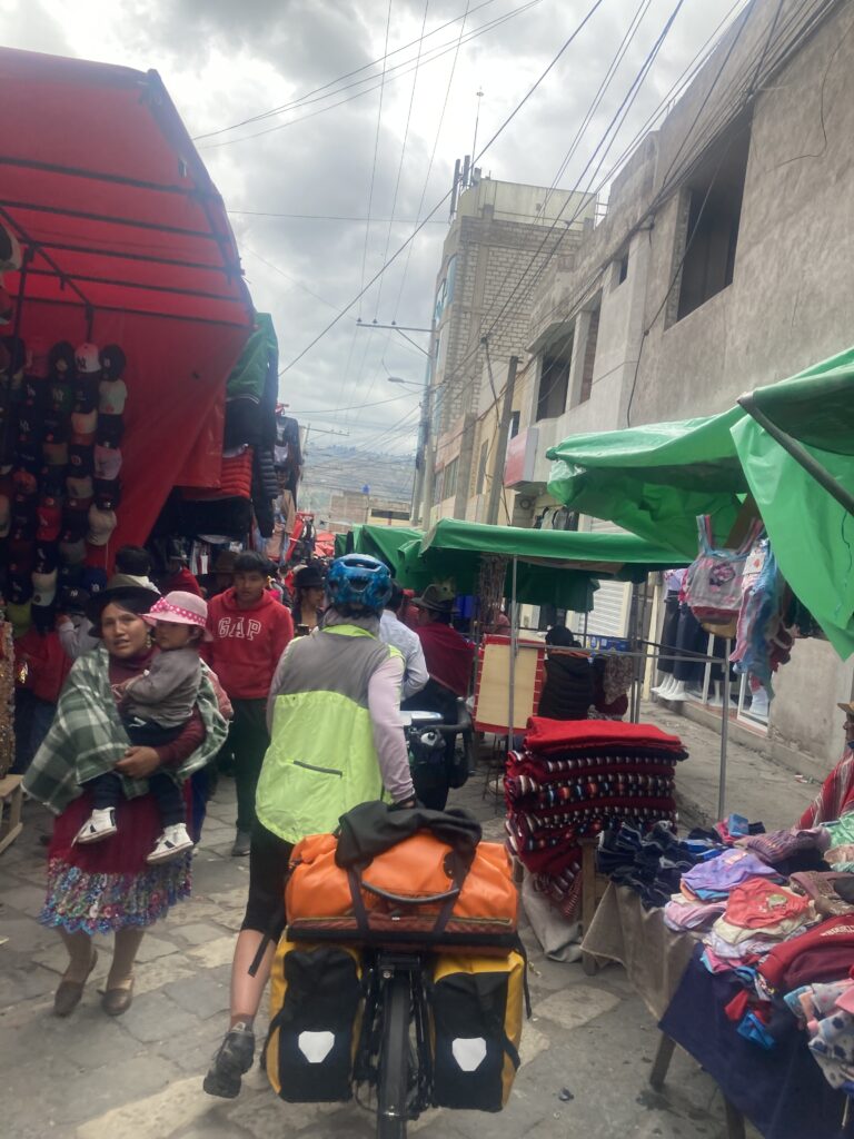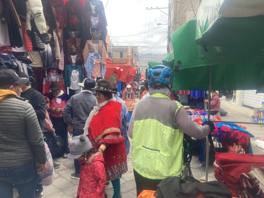 It was a gentle downward slope for the rest of the ride into Guamote – we were excited to have made good time because we’d heard that Guamote has a large Thursday market and it just happened to be Thursday. We came into town on the old Panamerican Highway and were shocked to find that the market takes over the ENTIRE town! In attempting to get to our accommodation we tried to turn down two streets that were just packed with people. Finally when the third street was also packed with people we decided we had to go for it and dismounted and walked the large loaded touring bicycles through the crowd. At one point a mattress moving down the street caused a market-jam and we just had to wait.