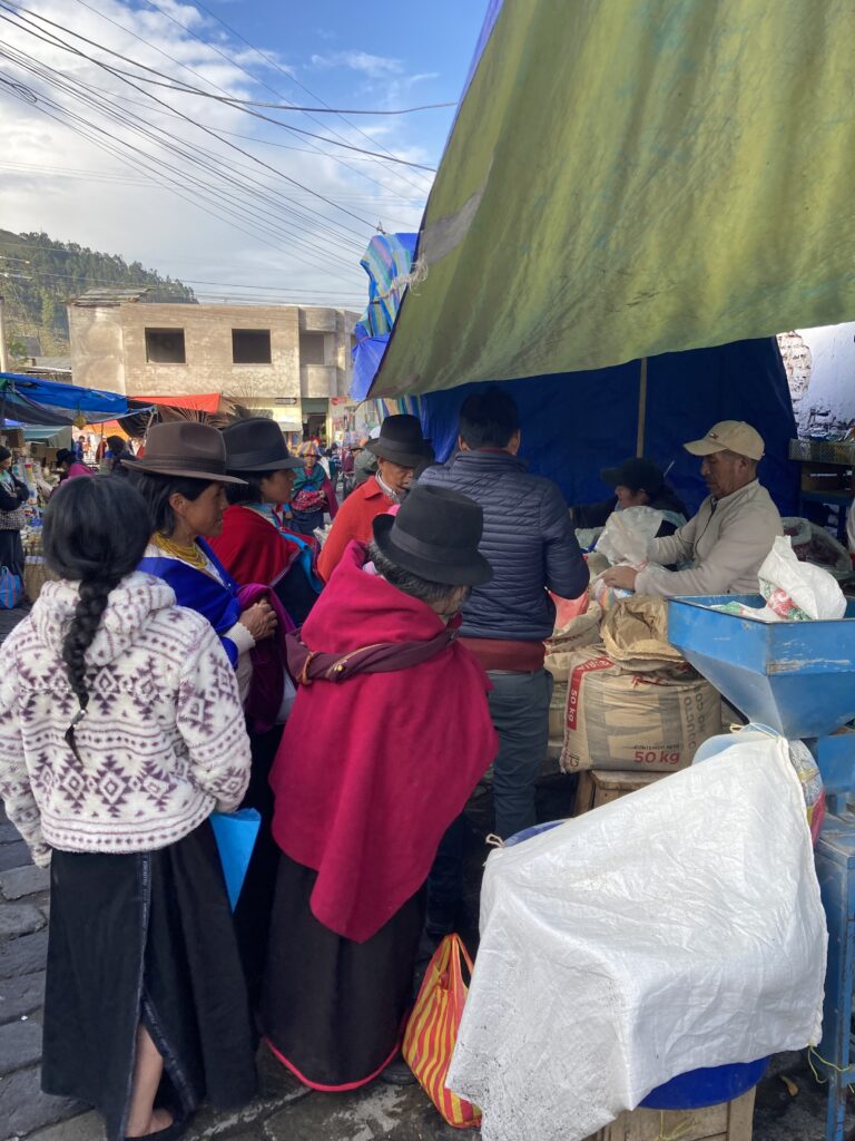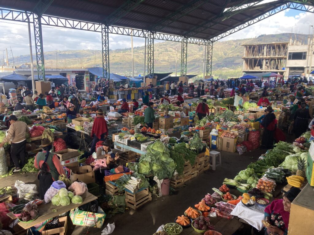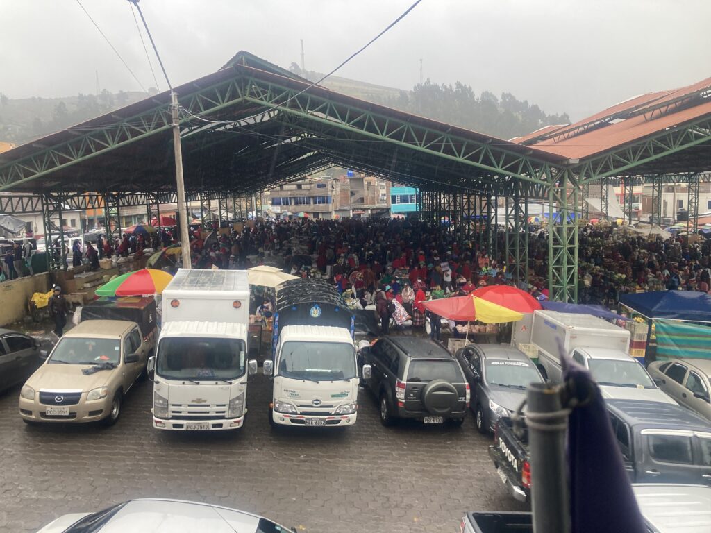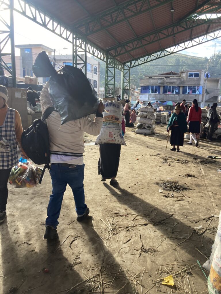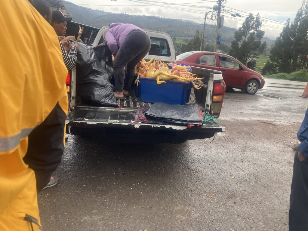 After the climb we cruised through farms and small villages before reaching the town of GuamoteOnce we got into Guamote, we realized how large the market was. With no other choice to get to our hostel, we walked the loaded bikes through the market.Walking through the market attempting to reach our hostel. Our hostel room window looked out on the main covered area of the market but it appeared the market took over the entire town.People wait to get grain milled with one of the vendorsChickens are bagged from the back of a pick-up truckPeople leave with large loads – the woman walking in front has a huge back of papas (potatoes) strapped to her back.The vegetable area of the market