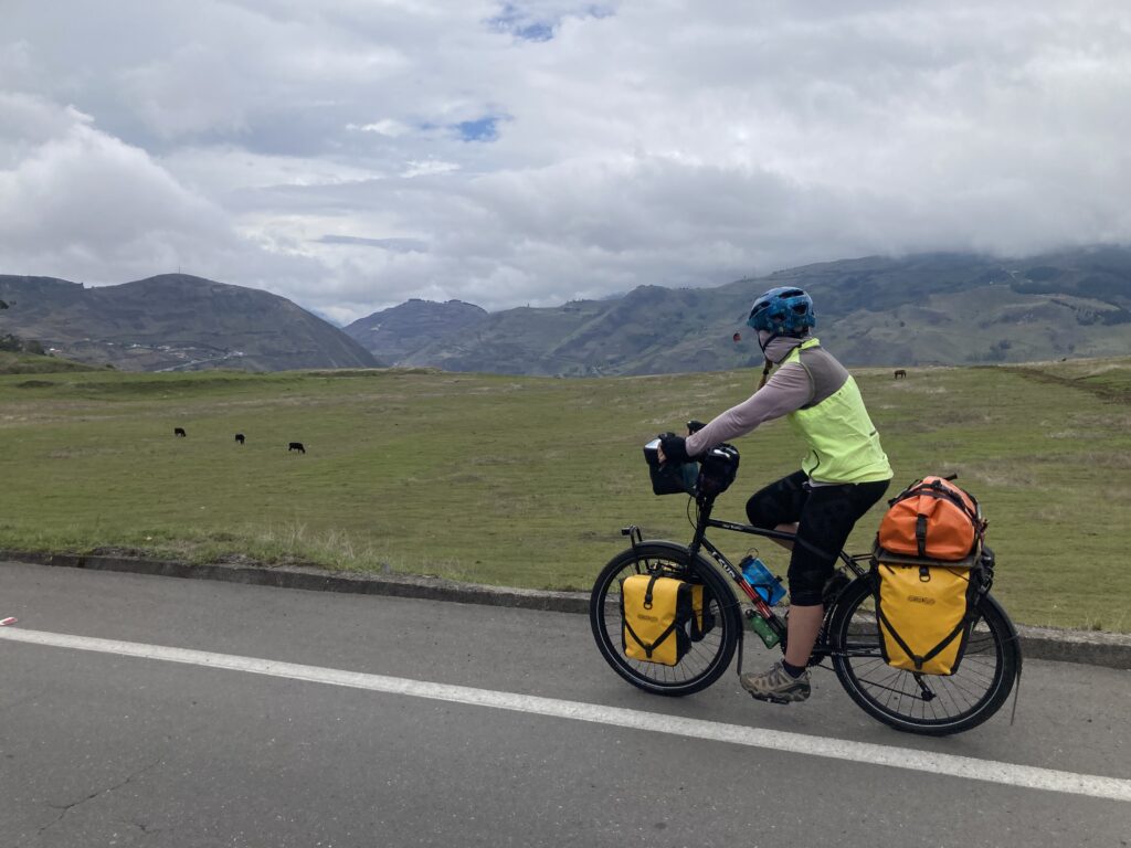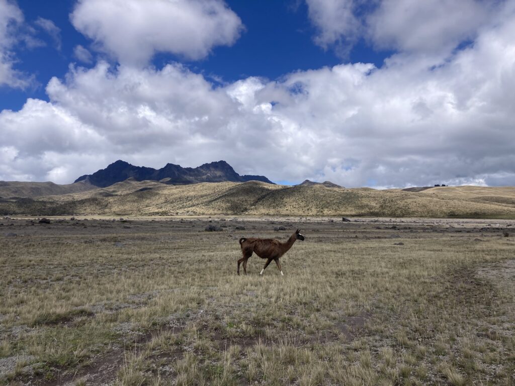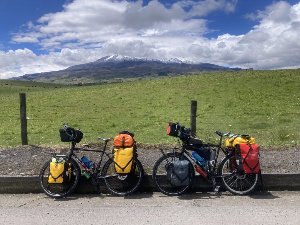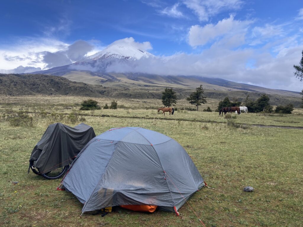The next day we cycled into Cotopaxi National Park through the less frequented North Entrance and were treated with epic views of this active volcano (5897 m / 19,350 ft) whose last eruption was in 2022-2023. Feeling the elevation in our lungs, and occasionally gasping for breath because we only had 62% of the oxygen compared to sea level, we were happy to get to our campsite after a mere 17km of cycling. For our first camping since Panama, we camped at 12,600 ft and enjoyed watching the clouds come and go, often very quickly, around the volcano.