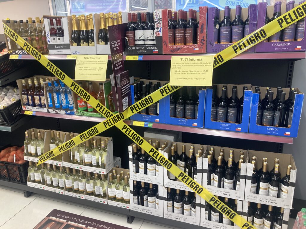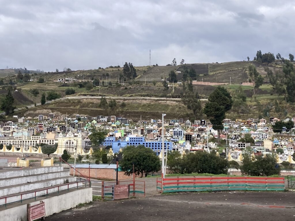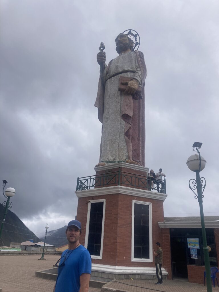 Leaving the town of Guamote we passed by this cemetery It was a beautiful ride all day longMore epic Andes riding – “this time I got your face instead of your back”Can you tell who takes all the pictures while we ride?!The town of Alausi set in the Andes mountains – it was a *steep* ride to get down there…and will be a steep clime to get out of there. Dustin coming down one of the very steep grades to get into townThe road, part of the Panamerican Highway, also included several switchbacksIn town trying to find our accommodation…Dustin the giantSo happy to be done biking for the dayA giant statue of Saint Peter watches over the town of Alausi.The famous Alausi trainWoman in Alausi with a child on her backDogs outside of a chicken roaster awaiting scrapsThis was so interesting…it was Friday afternoon and the sign stated no alcohol sales until Monday at noon because of the election on Sunday. We love how they used “Peligro” (Danger) marking tape 🙂