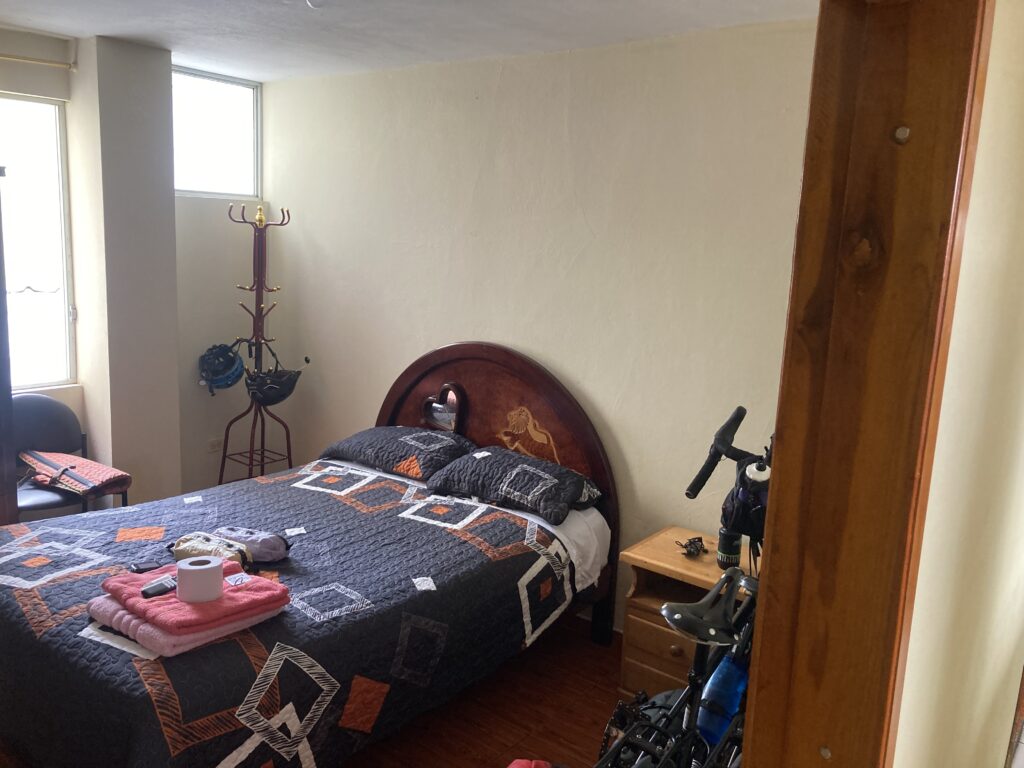 Fueling up for the day at the hotel’s included breakfast – “not oatmeal again!” It was a fruit plate, fresh juice (blended with sugar), eggs, & pan queso. Climbing out of Alausi was challenging but the road was in excellent condition and the little traffic that passed was polite. You can see our road in the middle and then on the right hand side of this picture – we pedaled quite a few switchbacks today. A tied up boar/pig eats next to the side of the road with an epic mountain view behind – we’re seen quite a few of these lately.Dustin takes in the valley below – we were above the cloudsWe do believe this is the “Nose of the Devil” the destination of the tourist train. Later in the ride the clouds rolled in…these “las letras” would have an amazing view without the cloudsThe church on the town square in Chunchi had a modernist flare – open your eyes Dustin! Patricia rides around the town square searching for an accommodationDustin started taking pictures and reviewing our accommodations for a bicycle touring app – here’s our room in Chunchi at the hostel.