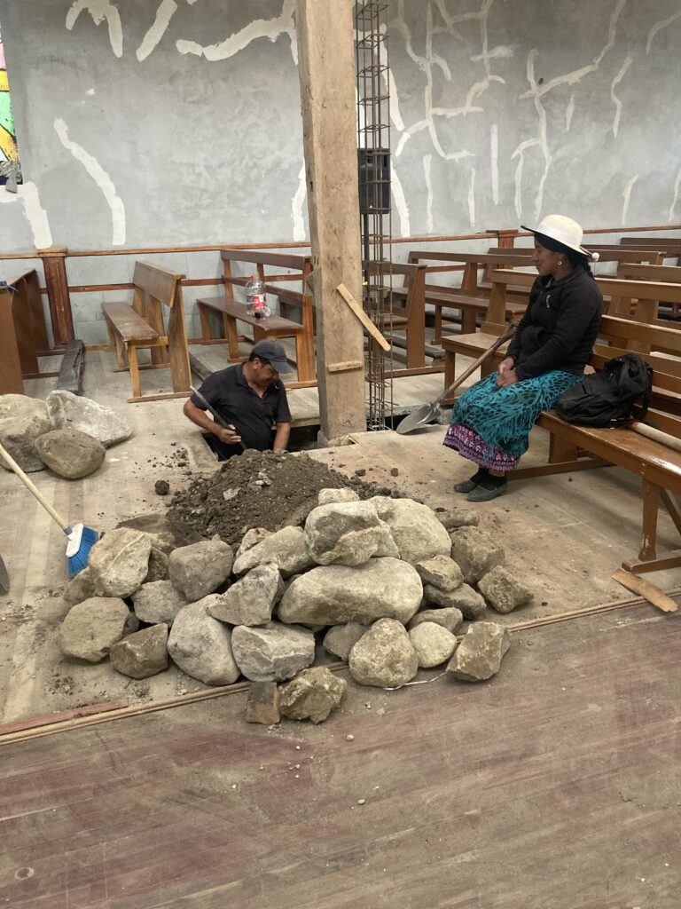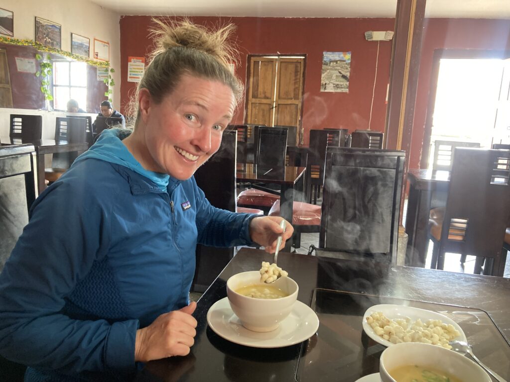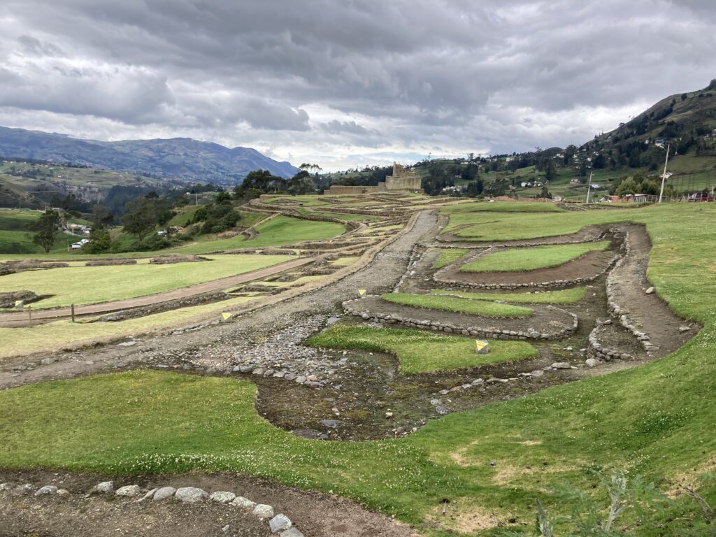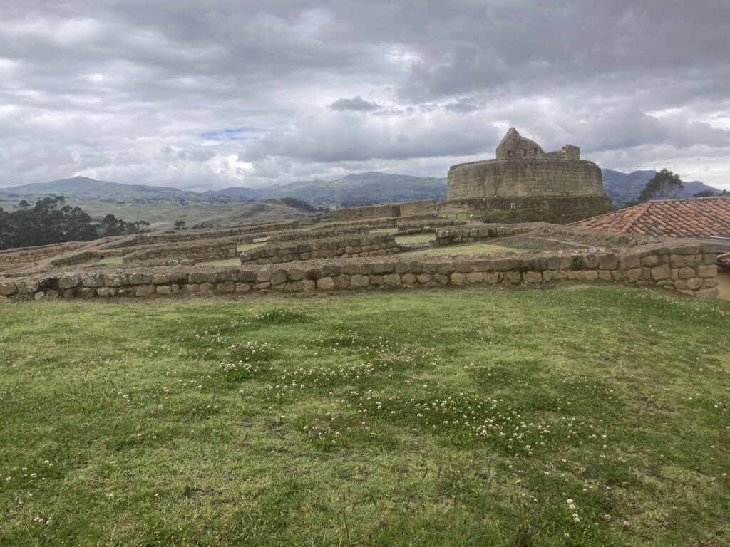 The proprietress of our hostel, Hostel Chasky Wasy, is indigenous Canaris and wore the traditional attire.We took the local collectivo bus out to a historical site – coin payments were put in plates when you exited the bus for easy change. Also, most busses we’ve seen are manual transmission 🙂 We took a bus to Ingapirca, the largest known Inca ruins in Ecuador, it was closed Sun – Tues but we were still able to walk around the exterior.Most famous for the Temple of the Sun, an elliptical shaped building made of non-mortared stone.First course of lunch was a soup where you added steaming mote, large boiled corn kernels. El Tambo’s church on the main square.Inside the church it appeared they were replacing the pillars but first they had to dig out the foundation and get to a solid base. A local woman provides moral support 🙂 A completed replaced pillar.