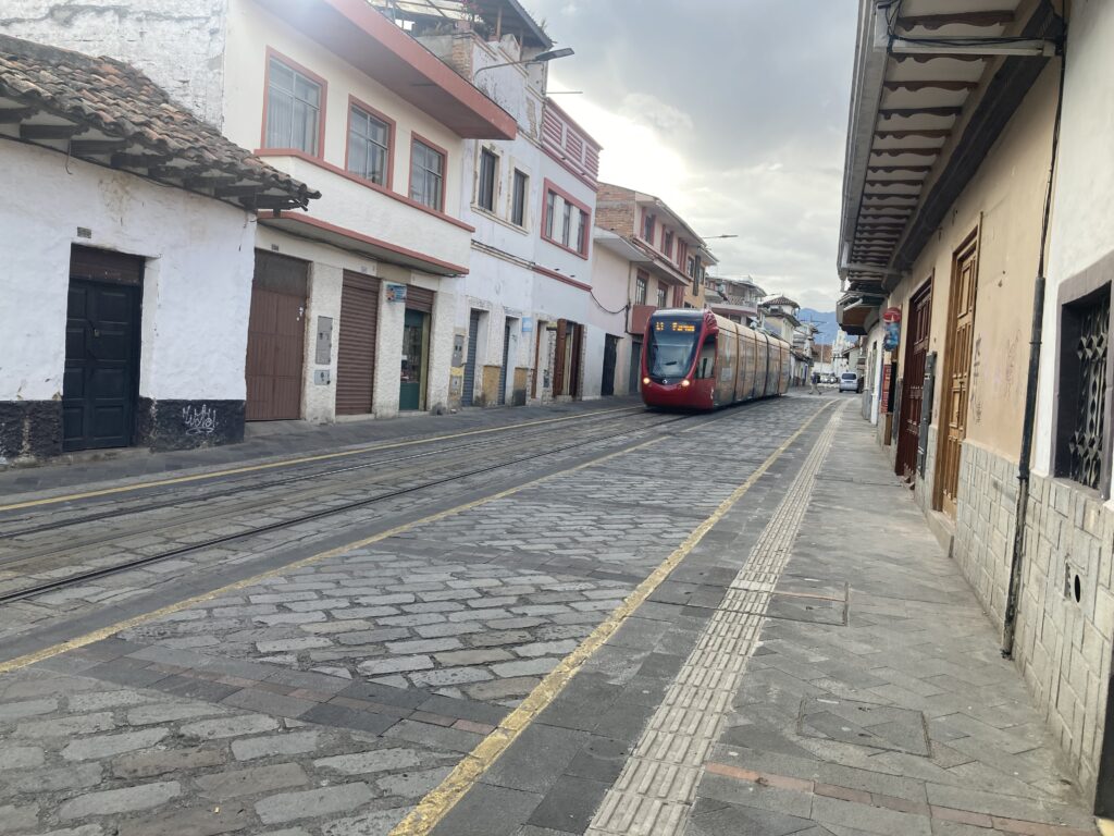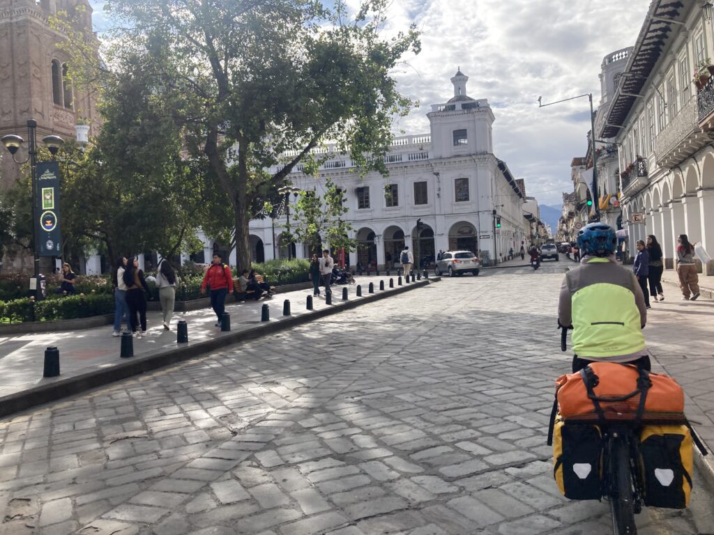 We decided to check our brakes before the 30k downhill into Cuenca – Dustin’s needed replacement. Patricia & her “friends” – the dogs of Ecuador have been more numerous and aggressive than we’ve seen all trip. A firm NO usually halts them but we’ve had to stop and dismount once for a particularly angry “friend”. Valley view back to El TamboFully rugged up, including booties/mitts, and ready for our wet & cold 30k downhill – it was not so fun…but we survived. Finally made it to Cuenca just in time for rush hourA square in CuencaThe street our AirBnB is on has a light rail running through it – so nice & quiet! Light rail coming down our streetOur AirBnB for one week – an industrial loft…just ignore all those clothes hanging over the railing to dry 😉We devoured a “familial” size vegetariano pizza (with corn!) Happy Patricia – showered, fed and off the bike for one week 🙂
