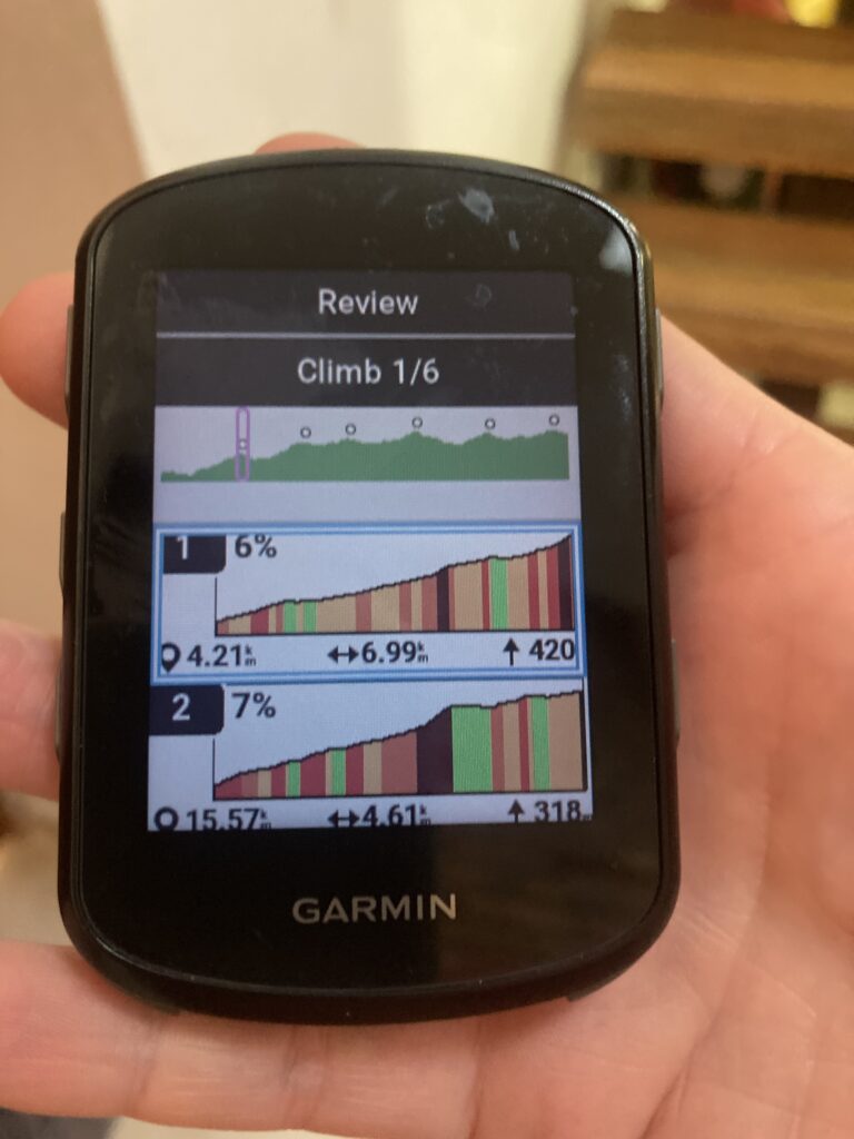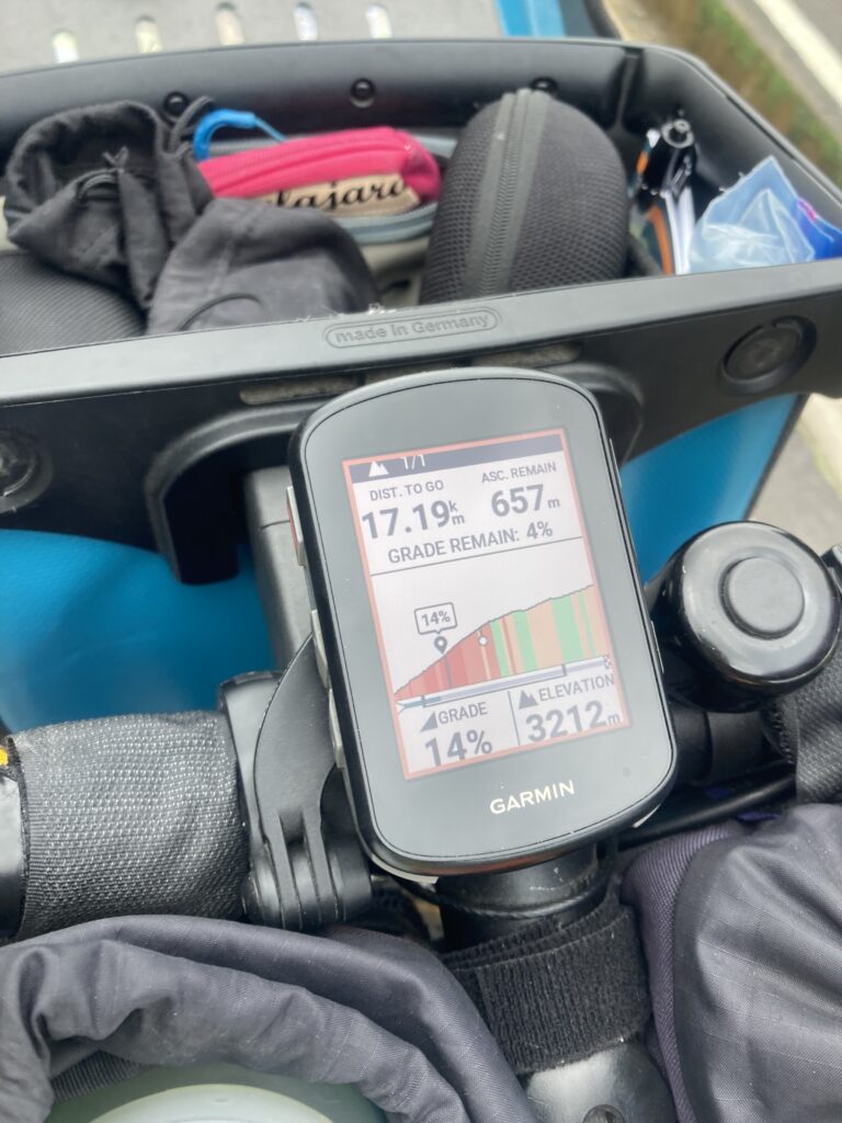 Our cycling Garmin (more like Patricia’s cycling Garmin because it lives on her bike) is critical for all our data: distance, altitude, climbs, grades, headings, etc.