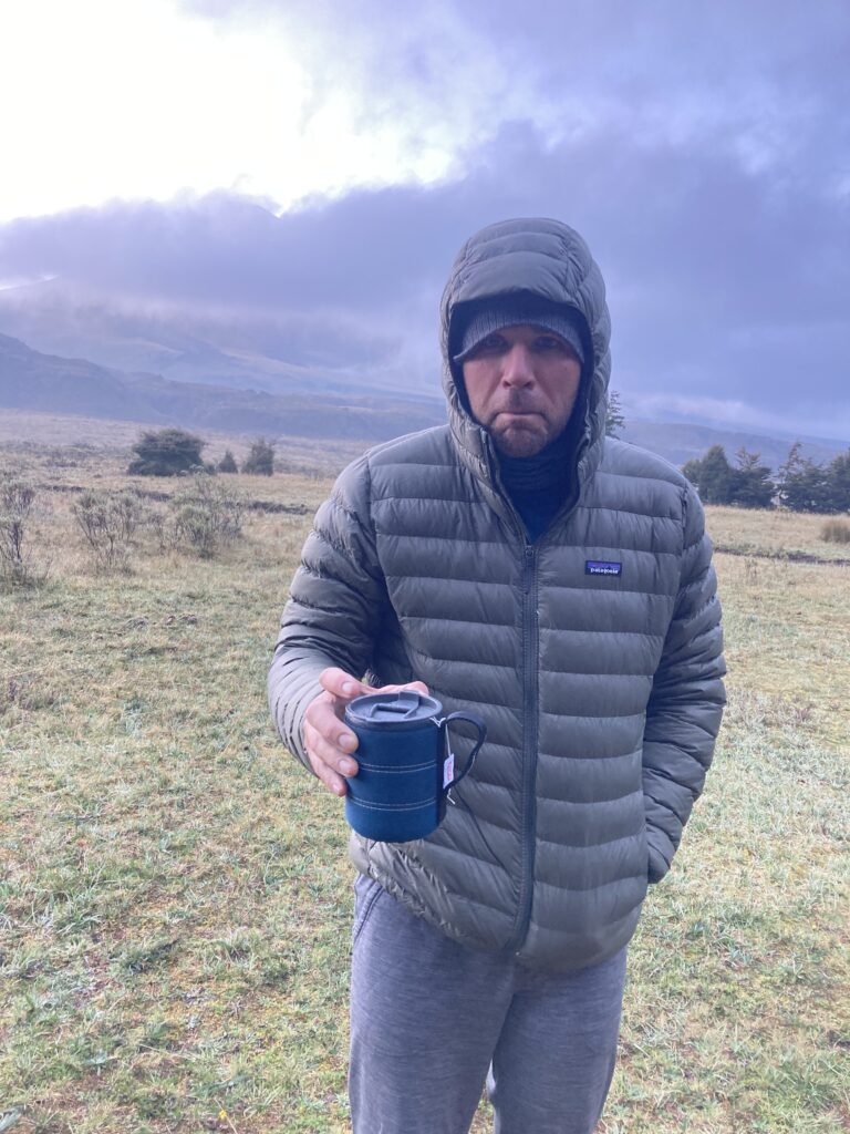 Dustin cycles towards Cotopaxi (19,350 ft) – Ecuador’s second tallest mountain. A llama in Cotopaxi National Park. Interestingly, the American outdoor brand, Cotopaxi, uses the llama as its mascot. While setting up camp Cotopaxi volcano was shrouded in clouds. We camped at 12,600 ft and were winded simply setting up the tent because of the lack of oxygen at this elevation.Views of Cotopaxi came and went all evening while we were camped. No volcano view, no coffee and it was 3C (37F) at 6:02 am – life is ruff!