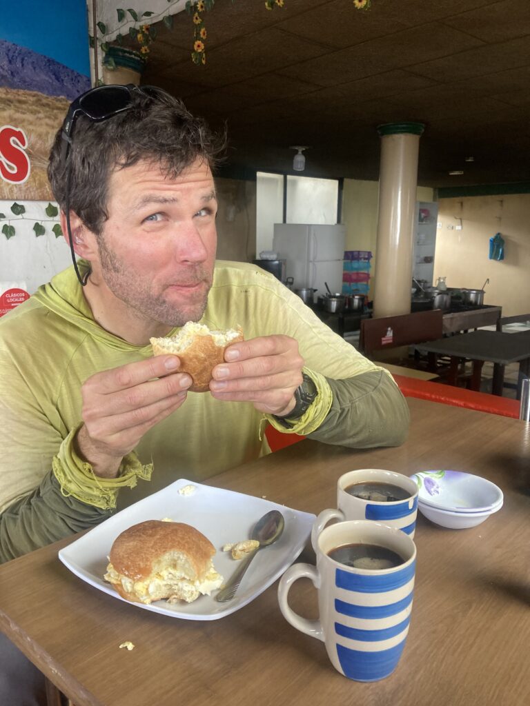 Climbing out of Ambato“Desayuno express” (breakfast) along the route – bread with cheese and a side serving of eggs…we made egg & cheese sandwiches. Patricia struggled with the climbing in the Andes…not sure if it was altitude or loss of fitness…here we stopped at a bus stop to take a break (the second time we had to stop to let her recover).