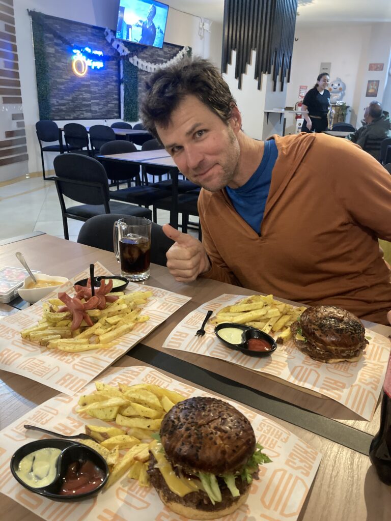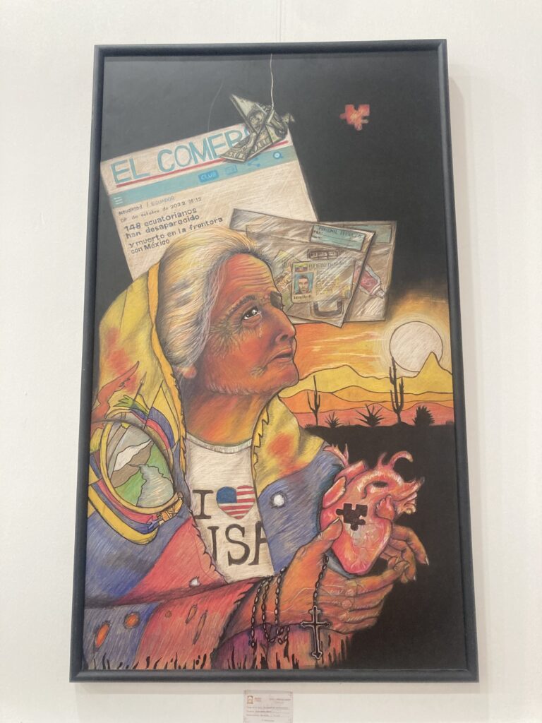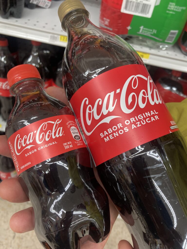 Finally to the top of the climb we let the bikes rest for a minute so we could take in a view of Chimborazo, the peak was hidden in the clouds.We’d cycled next to the world’s tallest mountain! Chimborazo selfie Fast downhill into Riobamba – took us 4 hours to go uphill and less than 1 hour downhill to cover about the same distance.On our way down the mountain toward the town we took another break and Dustin shows the largest size of Coke “Sabor Original” (original flavor) that we have found anywhere in Ecuador. All of the larger Cokes we’ve found have been “Sabor Original Menos Azucar” (original flavor less sugar)All of the larger Cokes we’ve found have been “Sabor Original Menos Azucar” (original flavor less sugar) – the tiny one on the left is the largest size of “Sabor Original” (original flavor) that we’ve found. Not sure if this is a local preference or government regulation?We had a very cute historic colonial hotel in Riobamba with a central courtyard and great HOT showers 🙂 Our first night in Riobamba we went out for burgers – something was lost in translation and we thought the burger didn’t come with fries so we ordered an additional side of fries by accident (still need to work on our Spanish!)Just across from our hotel At the city museum there was a contemporary art display and this one caught our attention – we think it says 148 desperate Ecuadorians died at the border with MexicoOn our rest day in Riobamba we did a walkabout and check out the local marketRiobamba walkabout Riobamba’s cathedral with Chimborazo visible in the distanceChimborazo looms large over the city of Riobamba