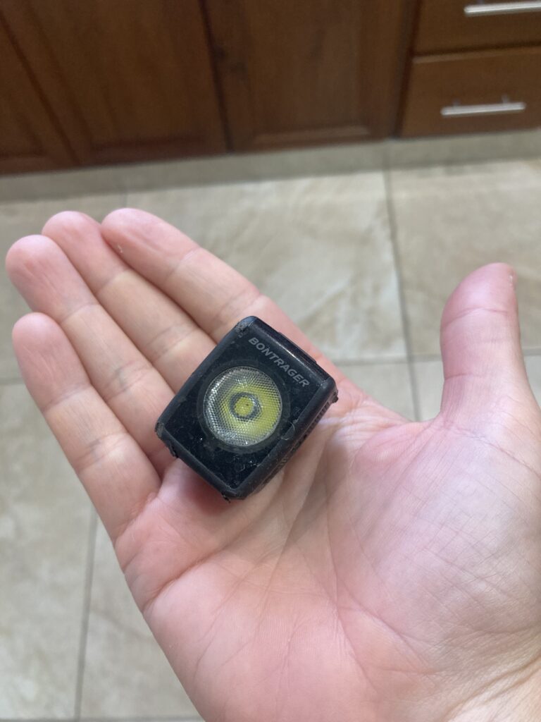*Trek (Bontrager) rear flare light fell off Dustin’s bike not to be found again – presumably the cobblestone jostling or his helmet, which was clipped to his rear bag at the time, knocked it loose.