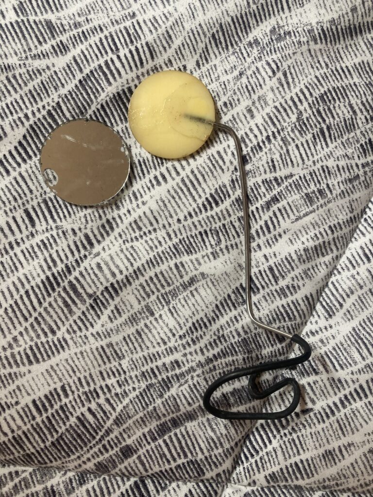 Patricia’s tiger-eye helmet mirror came apart and the mirror crashed on the pavement. Our brains are so trained to look in these mirrors that we ofter will look to the location they are supposed to be when not wearing them!