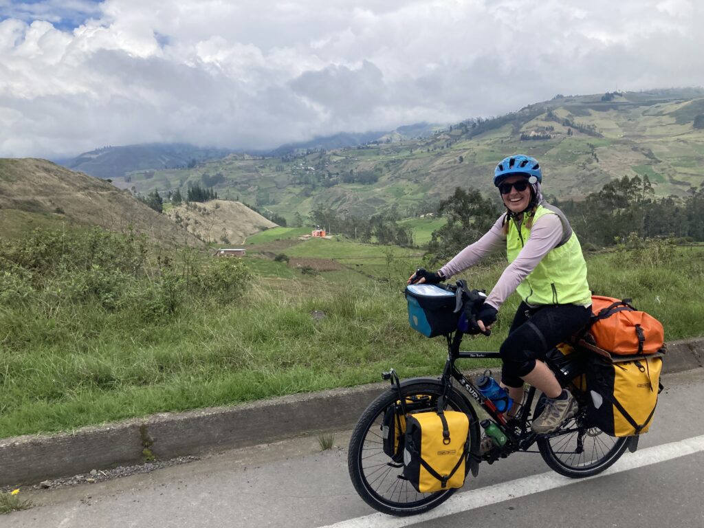 We cycled up to 11,800 ft and past Chimborazo, Ecuador’s highest peak at 6263m / 20,550 ft. The top of Chimborazo hid in the clouds for all of our viewings but it was still mighty impressive. Chimborazo is famous for being the world’s tallest mountain (when measured from the center of the earth as compared to measuring from seal level) because the earth is not a perfect sphere but rather bulges at the equator. So we claim we rode past the world’s tallest mountain on this bicycle journey 🙂