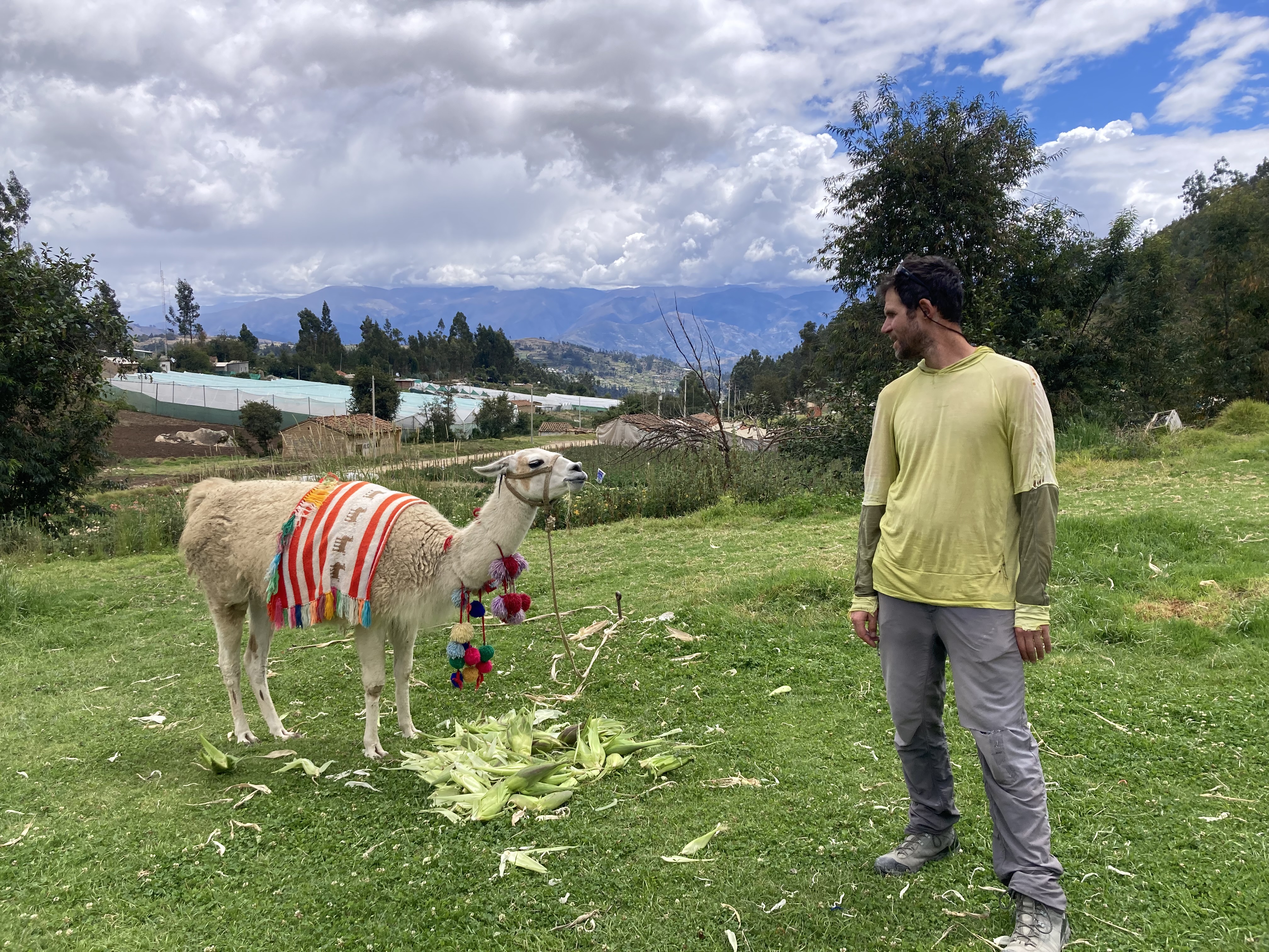 Dustin and a touristy decorated llama have a staring contest.