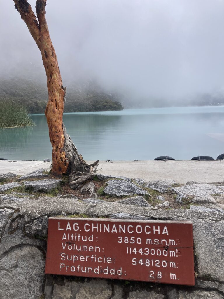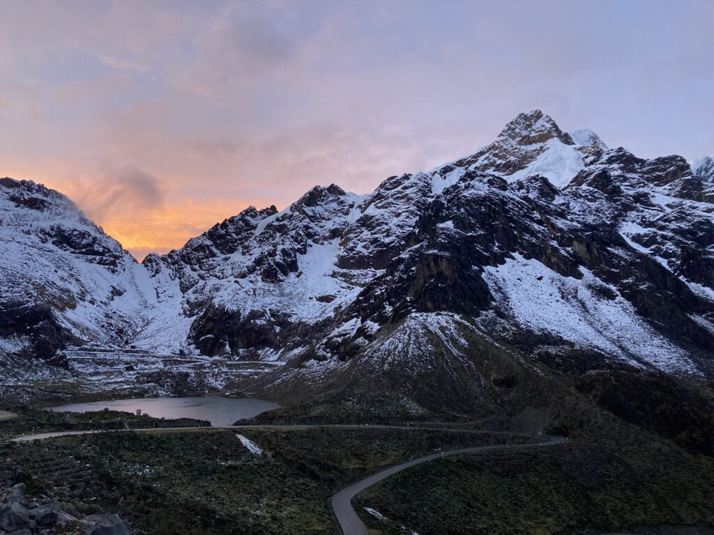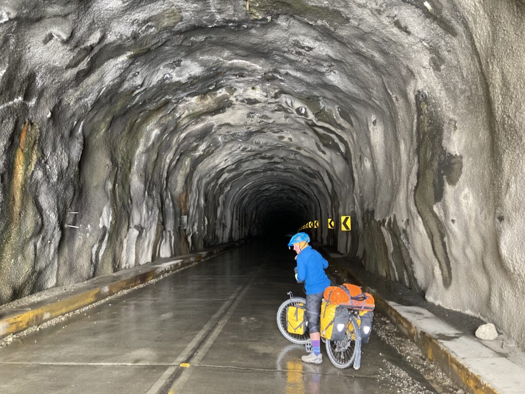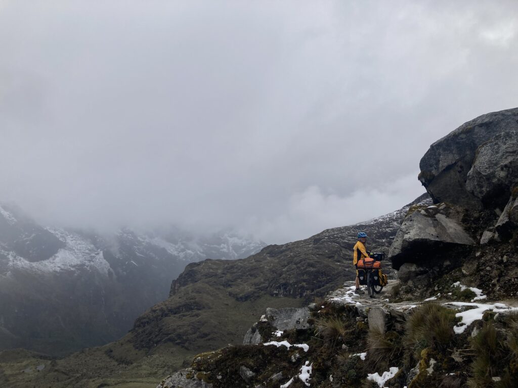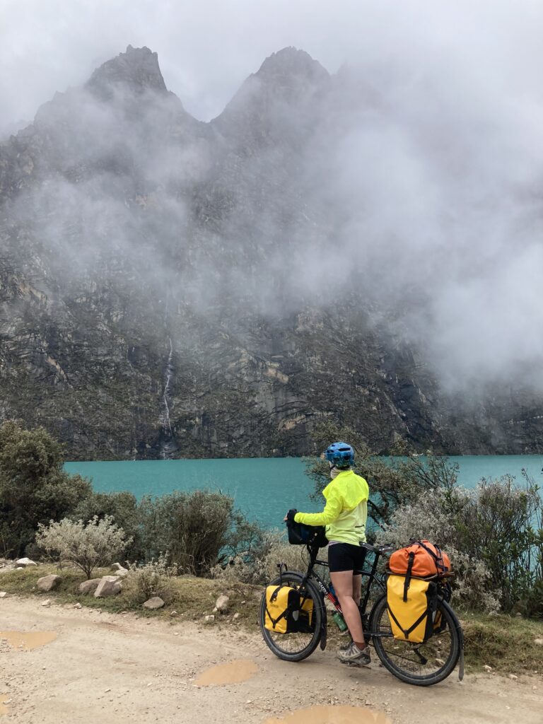 Crossing the Cordillera Blanca #1 – We stayed just outside of the park for the first night in a quaint circular structure with heat & hot water. We had a big day of riding planned for the next day so we were pedaling by 6:30am as it was not raining. There were two separate tough climbs planned on challenging gravel roads. We first climbed for almost 10km (6 miles) to a couple of famous high altitude lakes. The views of the lakes and canyon were shrouded in clouds so it kept our attention as glimpses of the mysterious surroundings came and went.