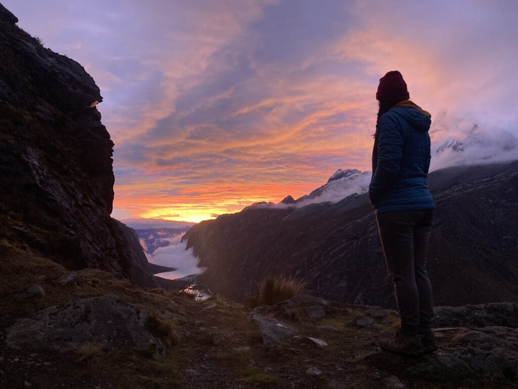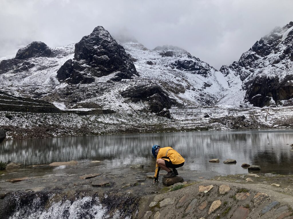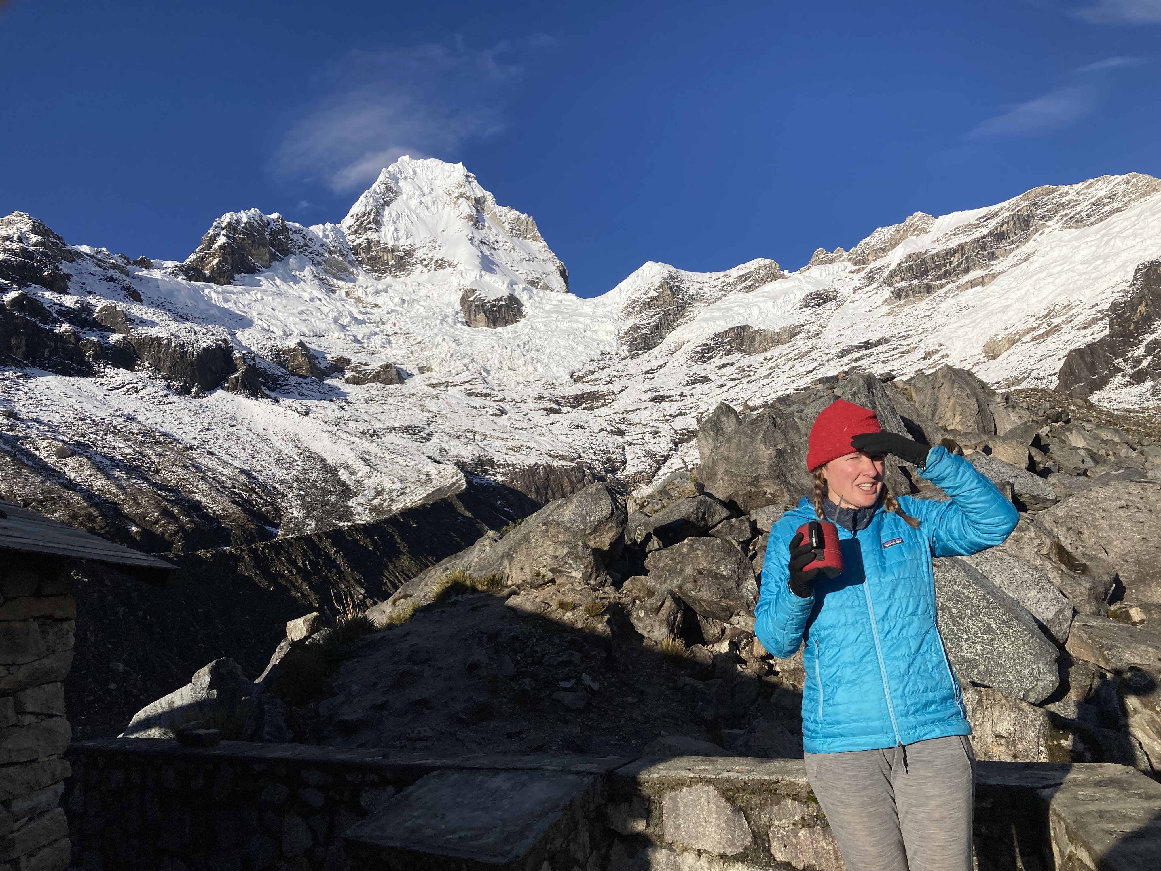 This descent was challenging because of the large rocks you can see in front of and behind Patricia. Also in this image you can see the snow-capped Cordillera Blanca just starting to peek out.