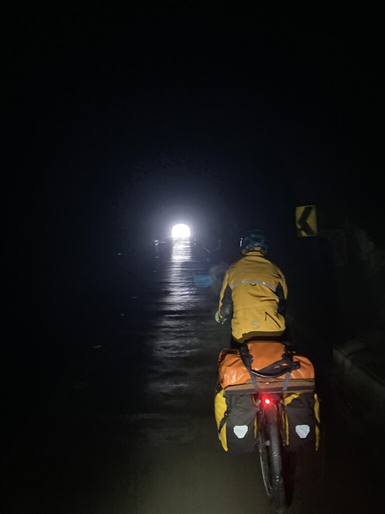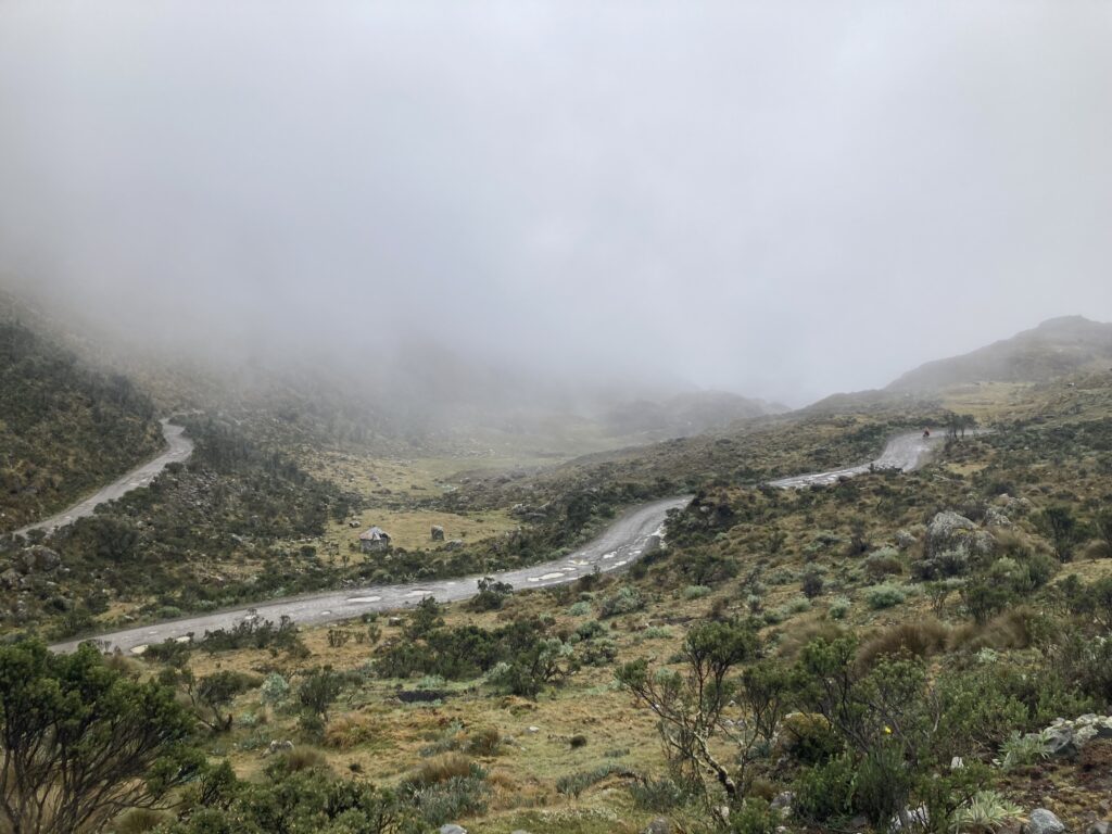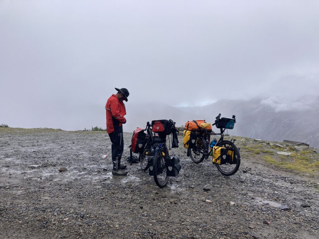 The next morning we awoke to more views, not quite as fabulous as the previous nights sunset. It wasn’t raining so we packed up and continued up the mountain for the summit. We dressed warmly but lighter as we would warm up quickly climbing to the top. When we left it was 5 C (41 F) and the road was almost constant streams of rain – quickly we decided it was easier and safer to just hike-a-bike to the pass. Eventually we reached the pass and the temperature was now 2 C (35 F) and snowing. Quickly we layered up and prepared for a chilly (and rainy) descent.