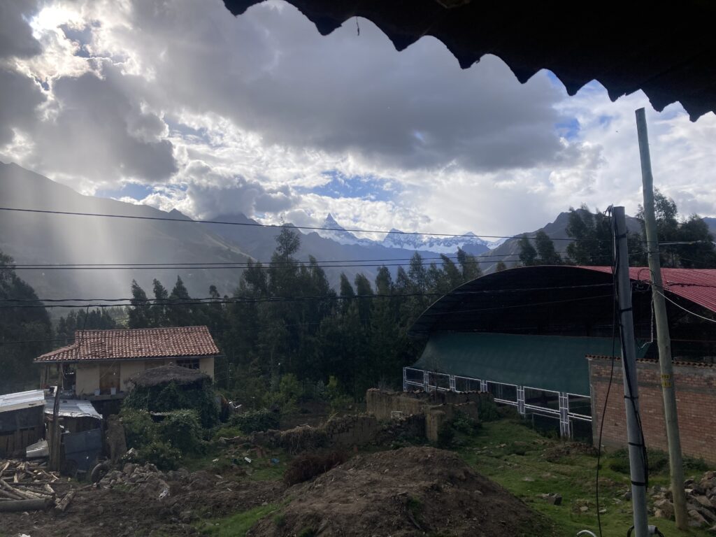 View from our lodge in Yanama – that super pointy peak in the middle of this image is Chacraraju 6108 meters (20,039 feet).