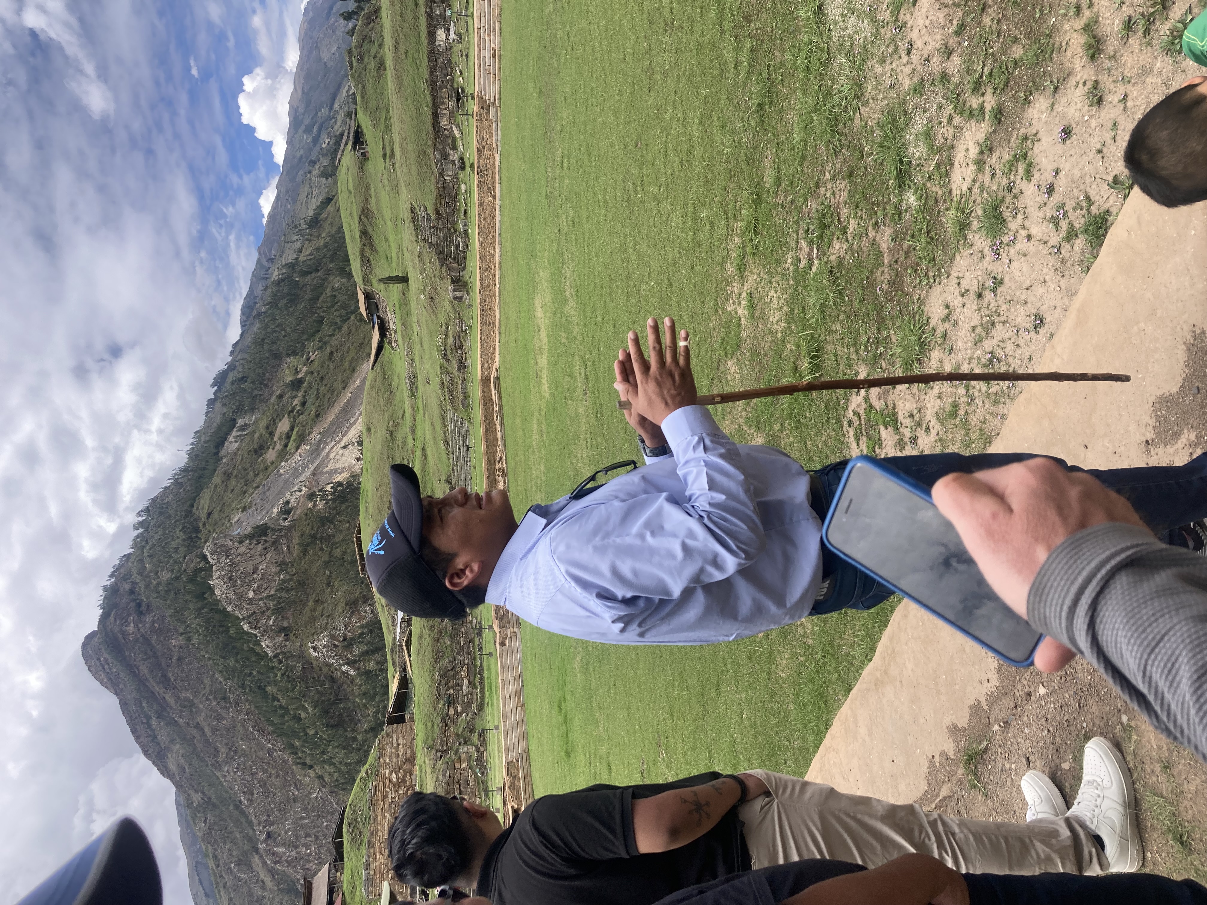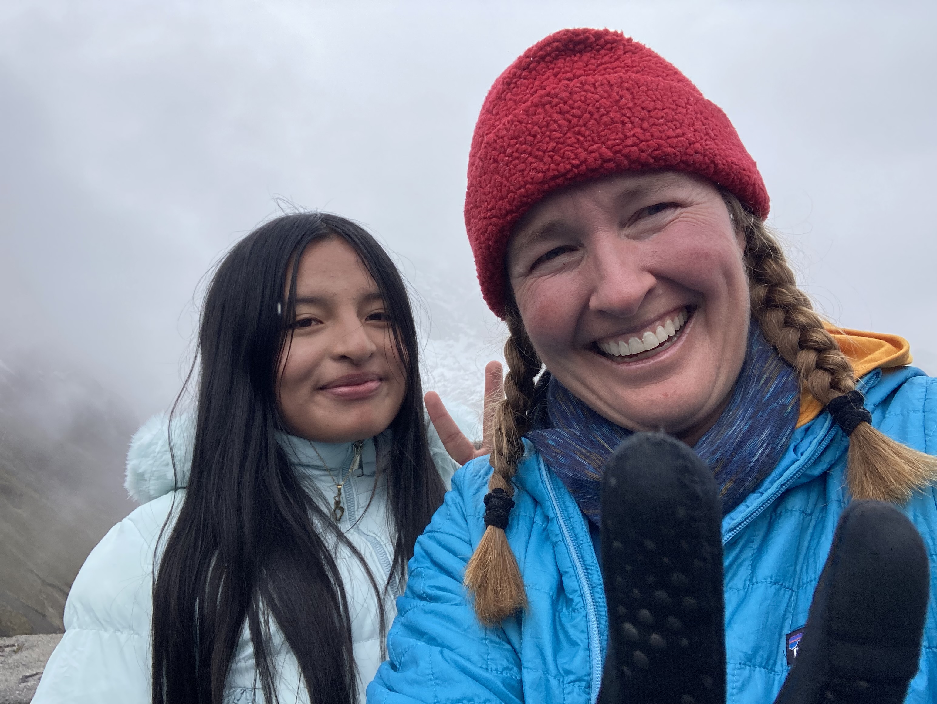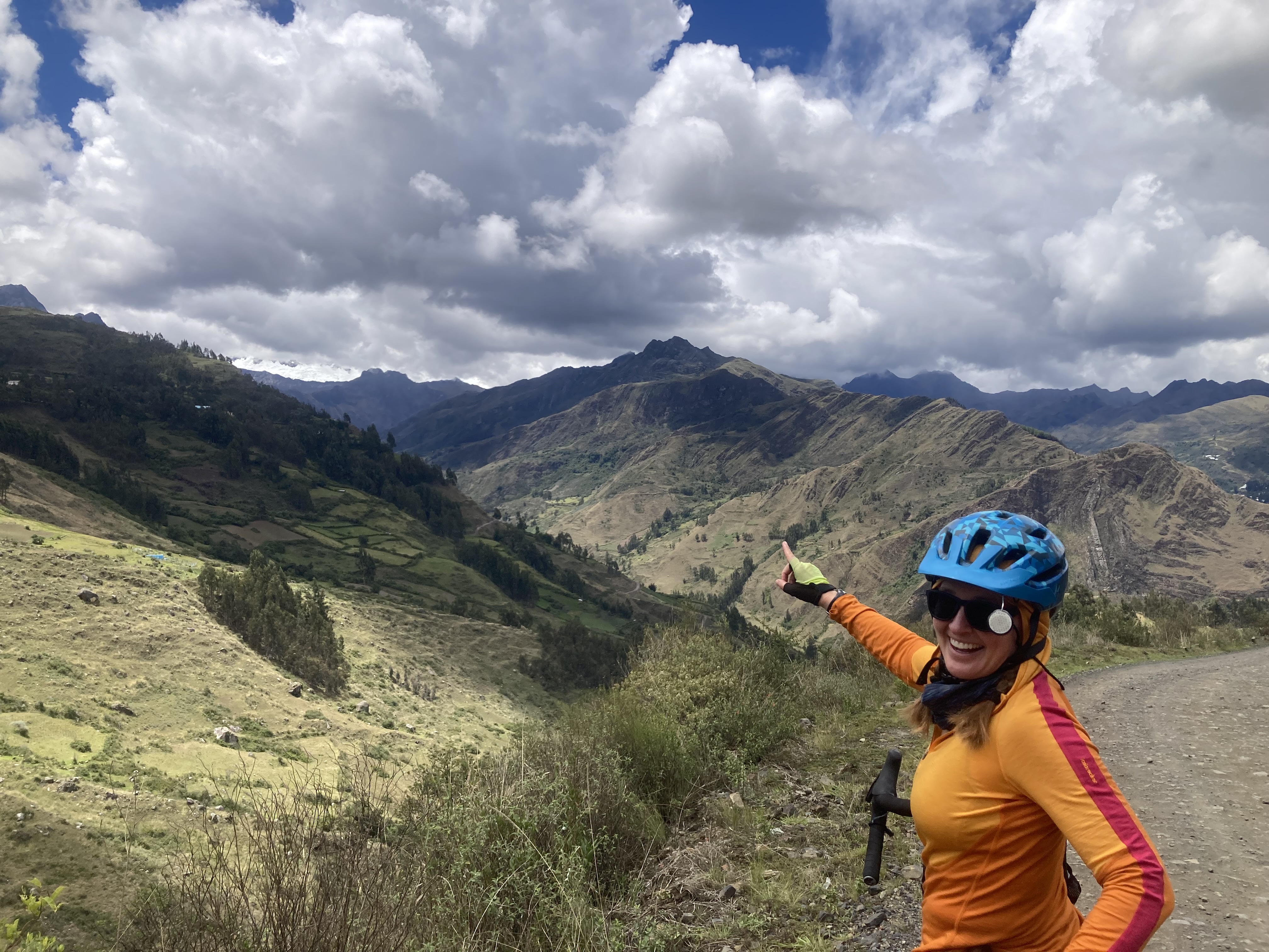 Patricia points to the white capped Cordillera Blanca peeking out under the clouds.