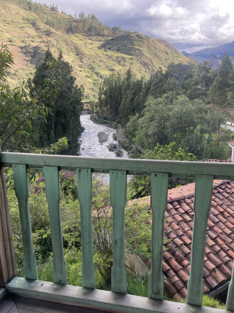 Our hotel in Acochaca was a delight. The proprietor, Miguel, built a lovely building with modern conveniences and tranquil gardens on his family’s historic property along the river. The balcony wrapped around the entire building with great views.