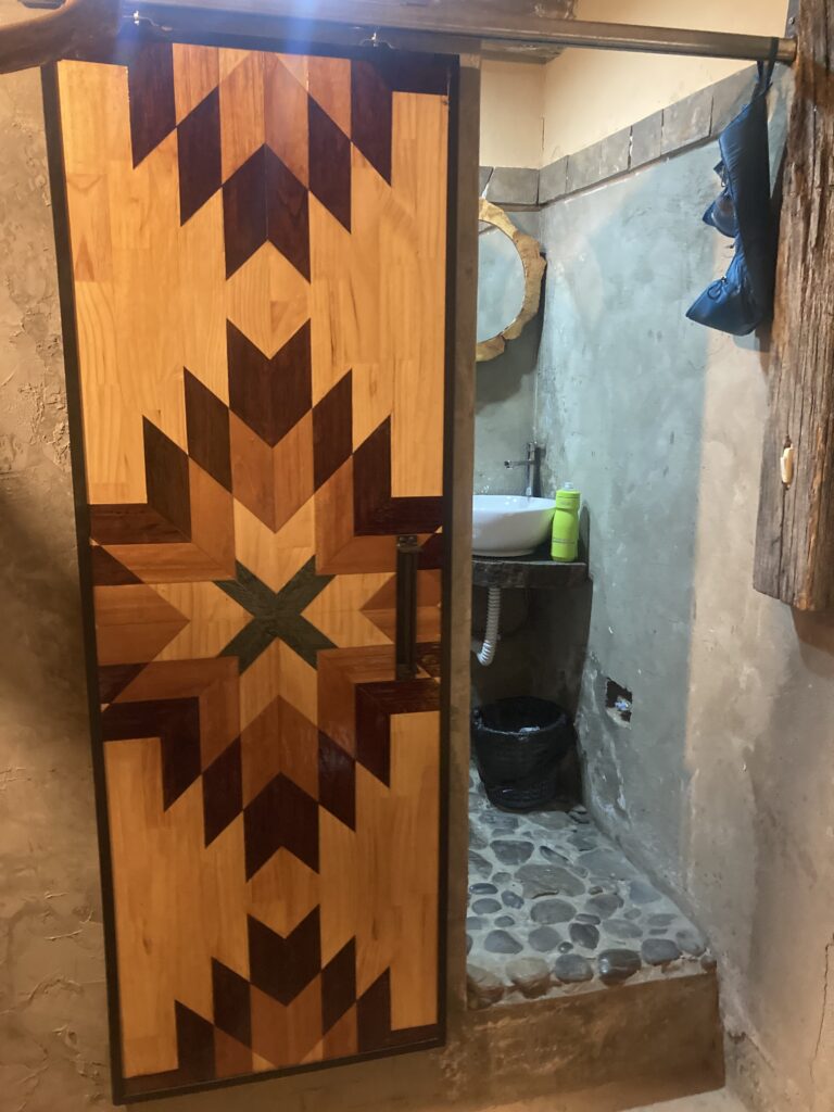 The lodge had an interesting artsy flair with all the work done by Sebastian – even the sliding barn door to our bathroom with multiple types of wood.
